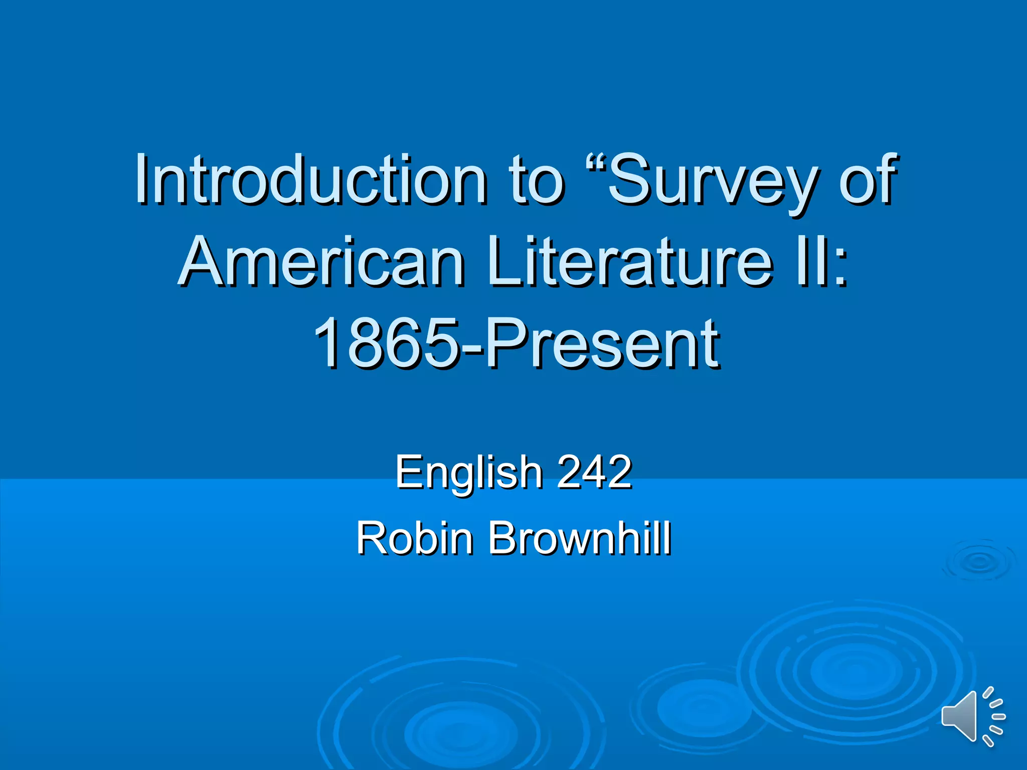 #2 Hi! And welcome to English 242, which is a survey of American literature from 1865 to present. I’m delighted to have all of you in my class and look forward to working with you this semester. This slide show is intended to give you an overview of the class.