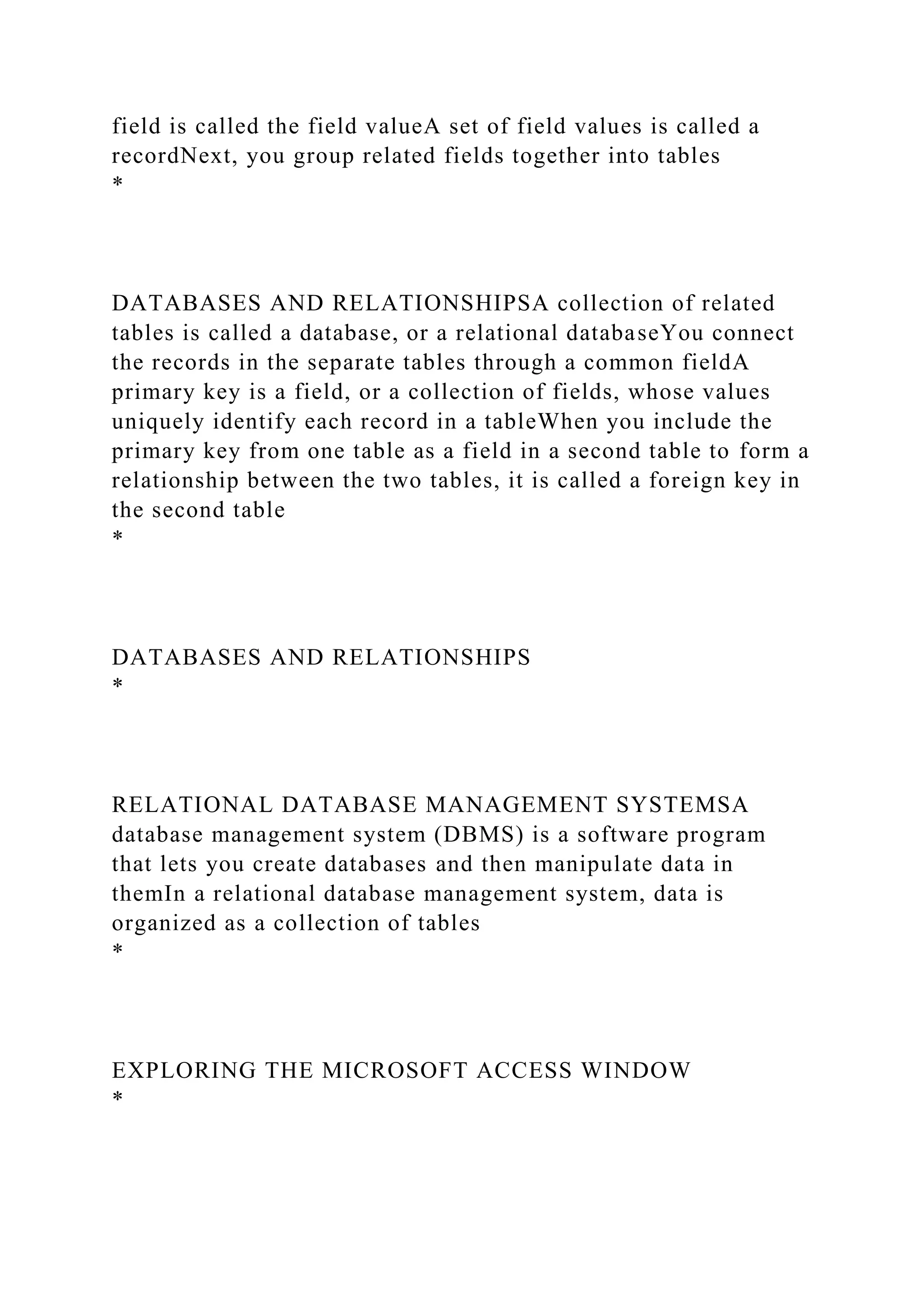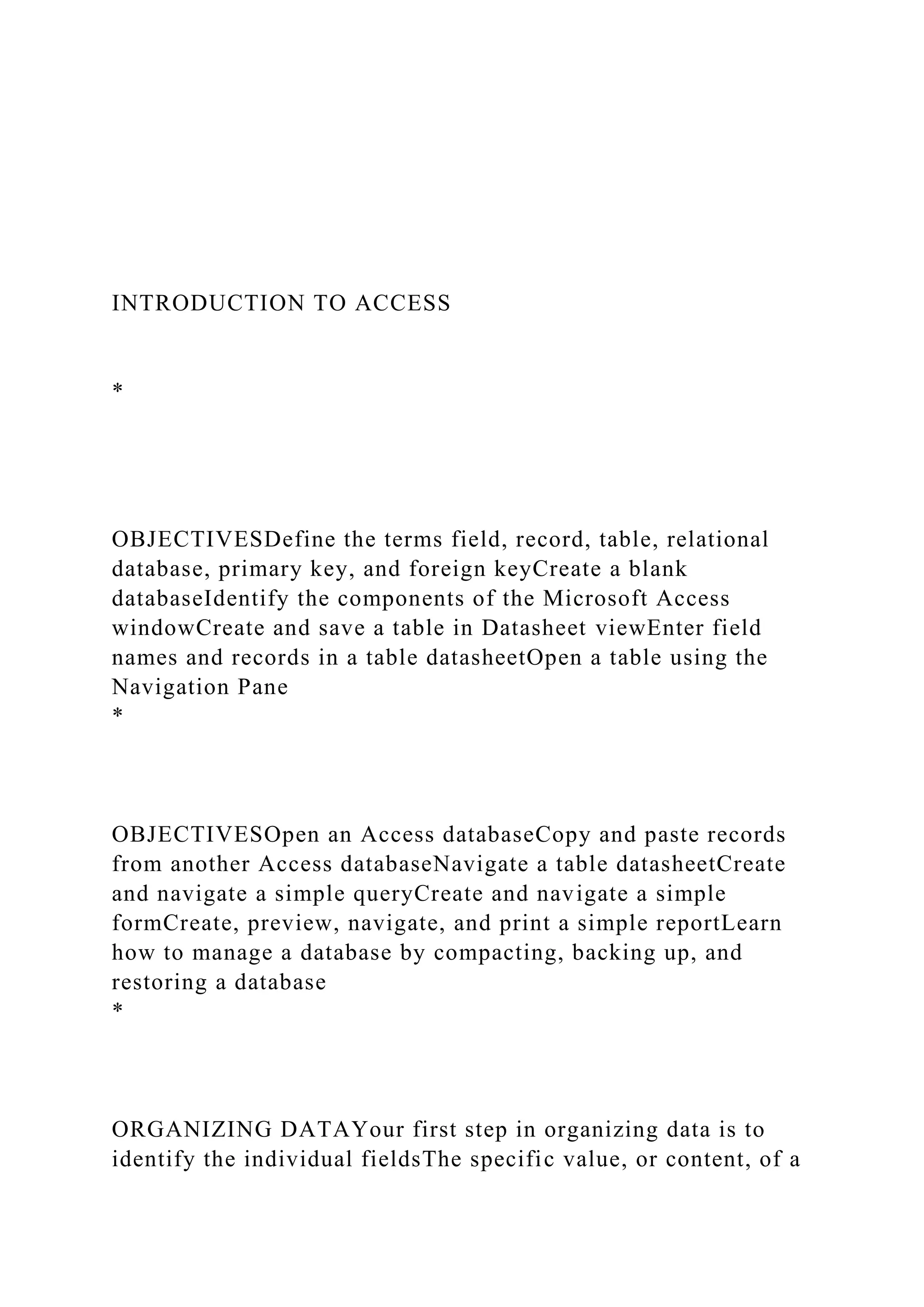 This document provides an introduction and overview of how to create and manage a Microsoft Access database. It explains key concepts like tables, queries, forms and reports. It also provides step-by-step instructions on how to create tables, add and edit fields, set primary keys, and enter data. Additional sections cover how to create queries, forms, and reports, as well as how to open, save, and compact an Access database. The goal is to give the reader a foundational understanding of the Access interface and the basic functions needed to build and work with an Access database.