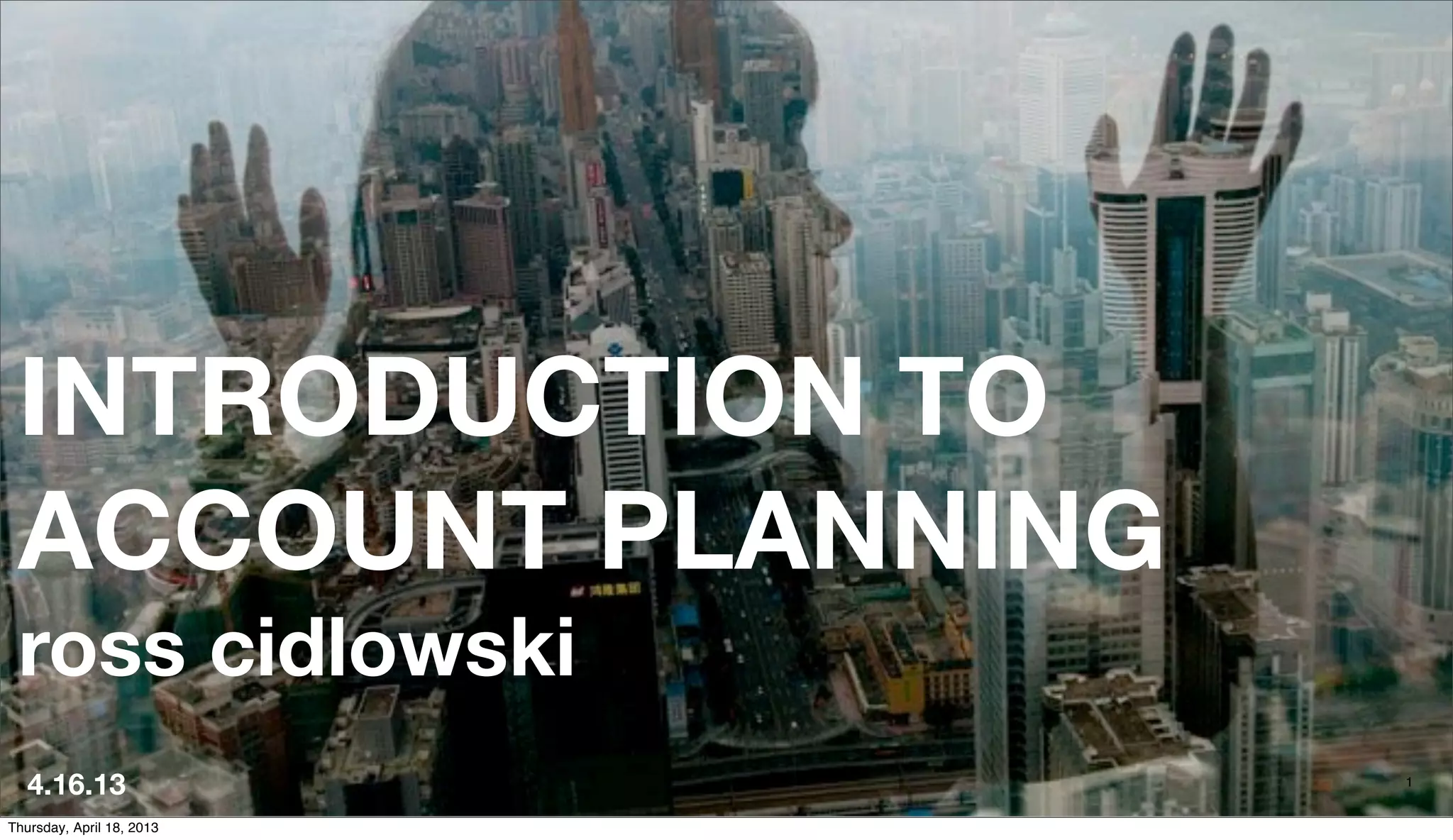 This document is an introduction to account planning presented by Ross Cidlowski. It discusses the history and role of account planning, which was invented in the 1960s to bridge research and strategy. Planners wear many hats including as explorers, storytellers, researchers and more. Their role is to ensure advertising work will actually be effective by developing insights and strategies, inspiring creatives, selling the work, and measuring impact. The document provides examples of how planners contribute and advises those working with planners to give them time and space to think, bring ideas every day, and not fear failure.