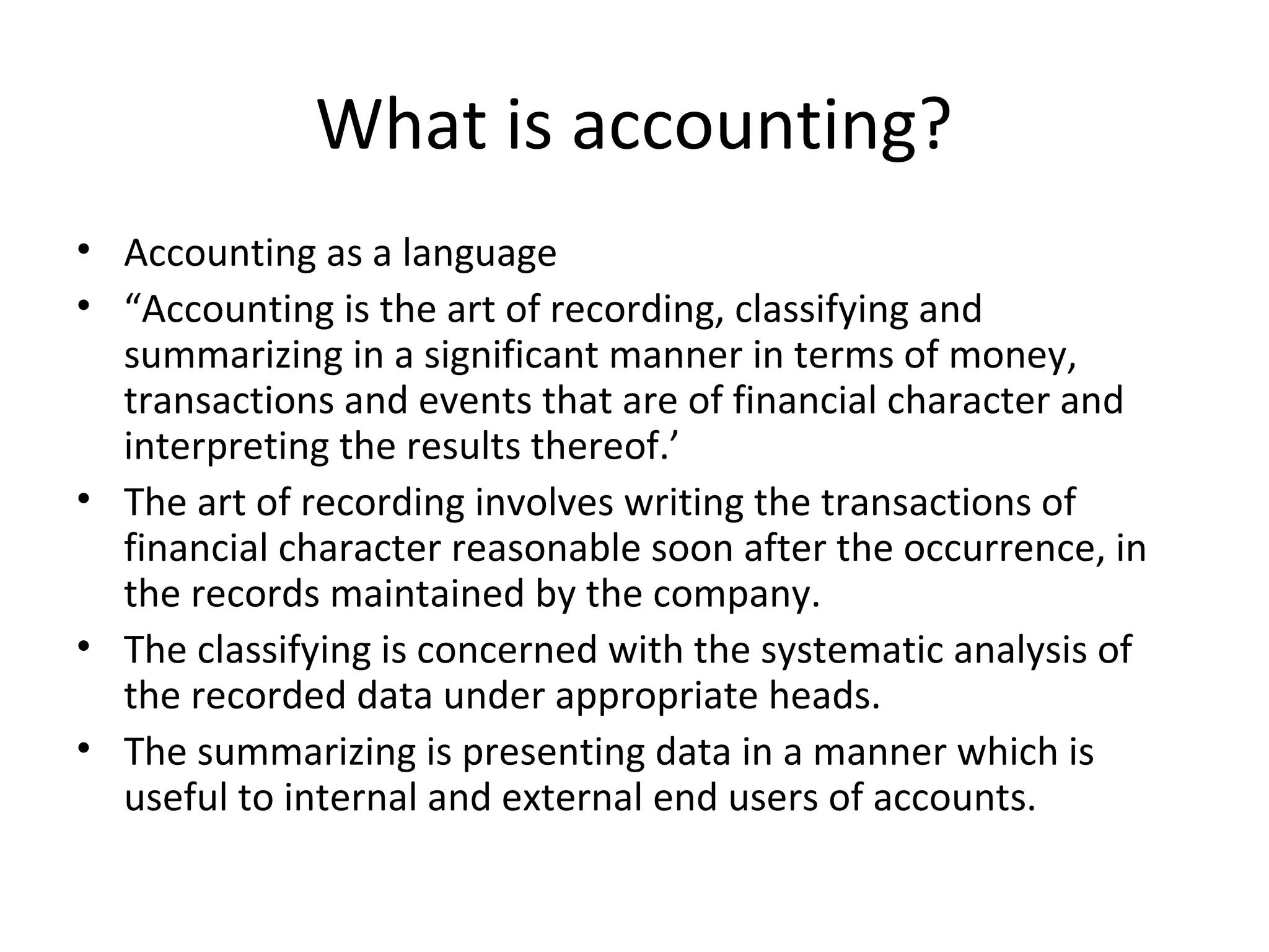 This document provides an introduction to accounting. It defines accounting as recording, classifying, and summarizing financial transactions and events in terms of money. Accounting involves recording transactions, classifying data into appropriate categories, and summarizing data to be useful for internal and external users. It discusses the different types of accounting activities and various accounting terms such as assets, liabilities, revenues, expenses, and financial statements.
