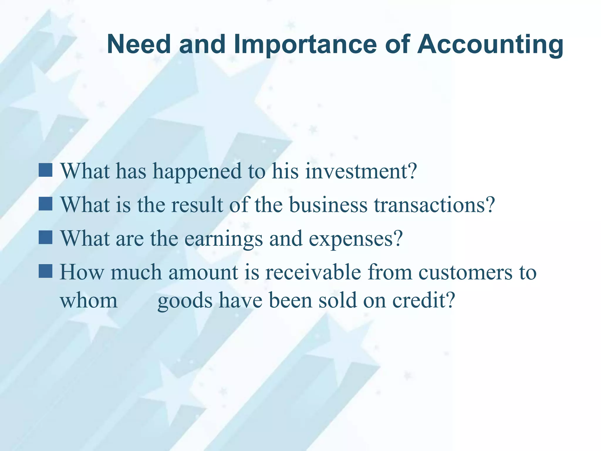 This document provides an introduction to the concepts of accounting. It defines accounting as a system that collects and processes financial information to allow informed decisions by users. It discusses the need for accounting to determine results of business transactions and the financial position. It outlines the key functions of accounting like identifying, recording, classifying, summarizing, analyzing, interpreting and communicating financial information. It also discusses the accounting cycle and different branches and users of accounting information. Finally, it provides definitions of some basic accounting terms.