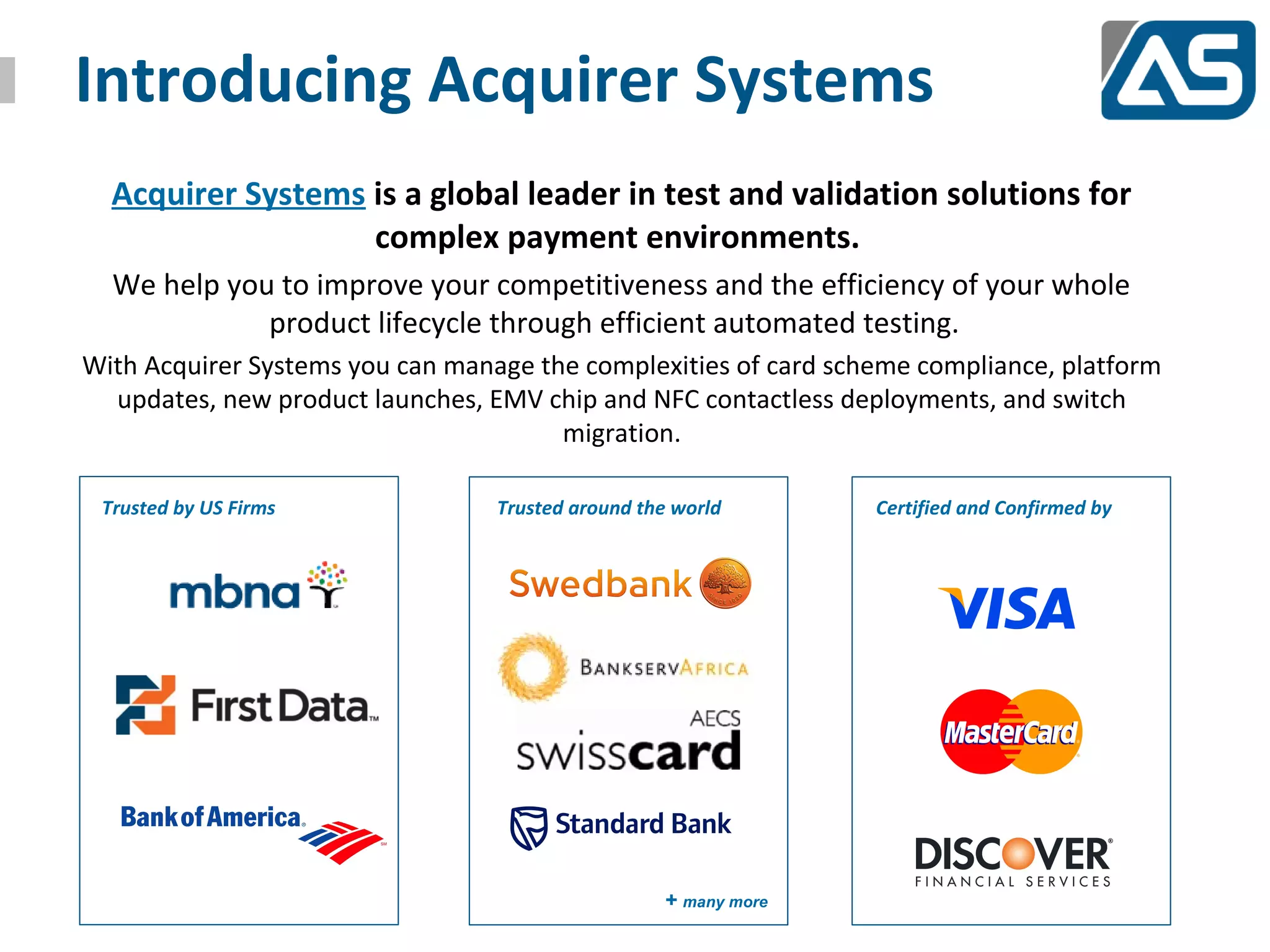 Acquirer Systems is a global leader in testing and validation solutions for complex payment environments, helping clients enhance product efficiency and compliance. The document discusses market dynamics in payment systems, emphasizing the need for improved testing capabilities and faster product delivery in response to evolving customer demands and emerging technologies. Acquirer Systems offers a comprehensive testing platform that streamlines the product lifecycle and mitigates risks associated with payment processing.