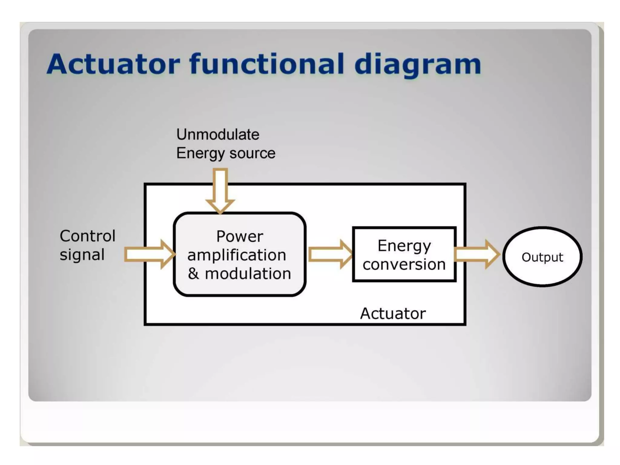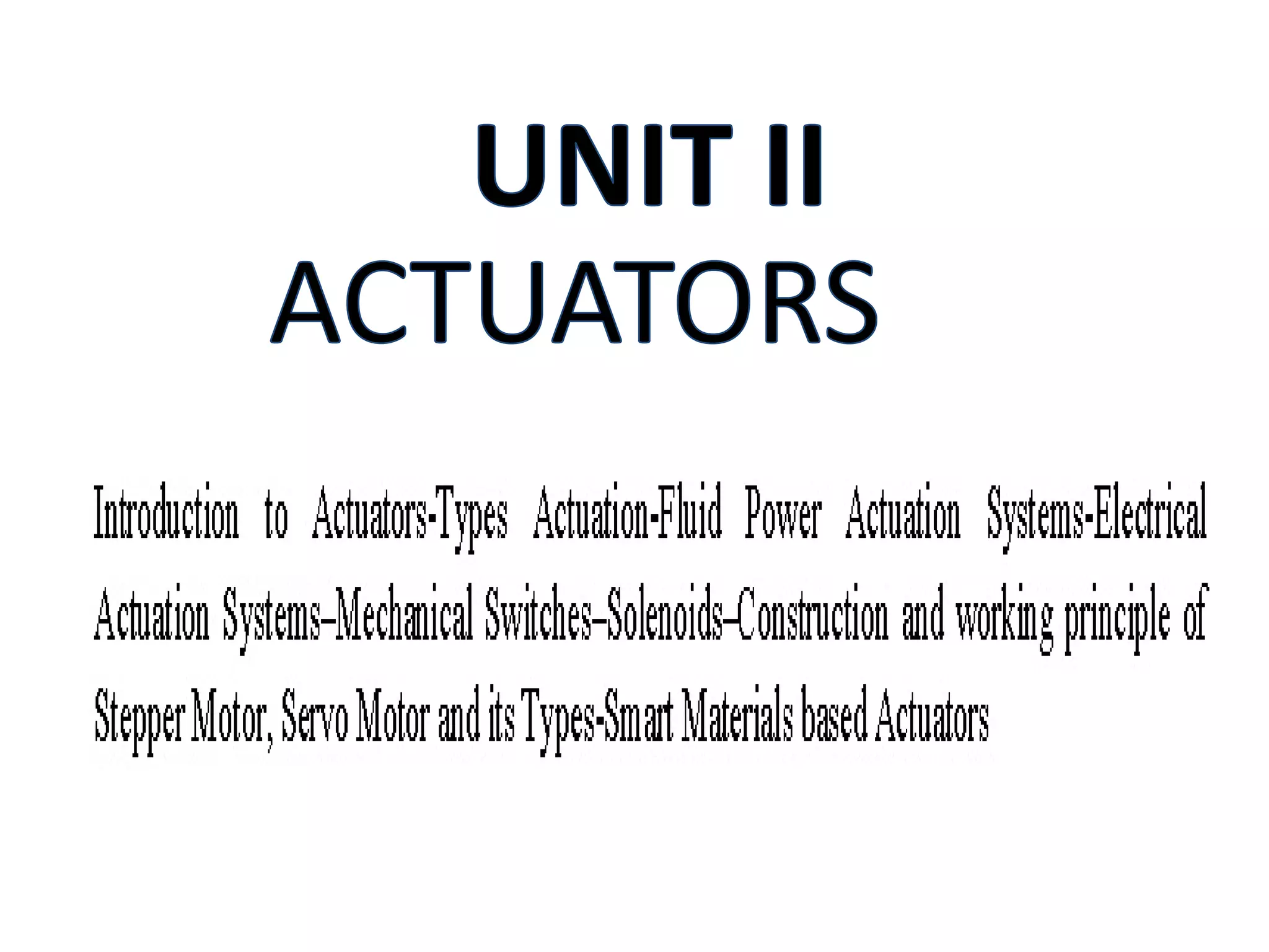 An actuator is a device that converts a control signal into mechanical motion. Actuators require a control signal and a source of energy. Common types of actuators include hydraulic, pneumatic, mechanical, electrical, and piezoelectric actuators. Actuators are used in a variety of applications such as industrial machinery, vehicles, medical devices, consumer electronics, and more. Stepper motors and servo motors are types of electrical actuators that provide precise motion control.