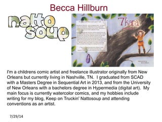 This document provides an introduction to alcohol-based markers, including Copic, Prismacolor, and Letraset brands. It discusses the characteristics of alcohol-based markers, such as their ability to blend colors. It also covers storage, techniques like shading, and common papers used with these markers. The presenters are Becca Hillburn and Heidi Black, comic artists promoting their work at an upcoming convention.