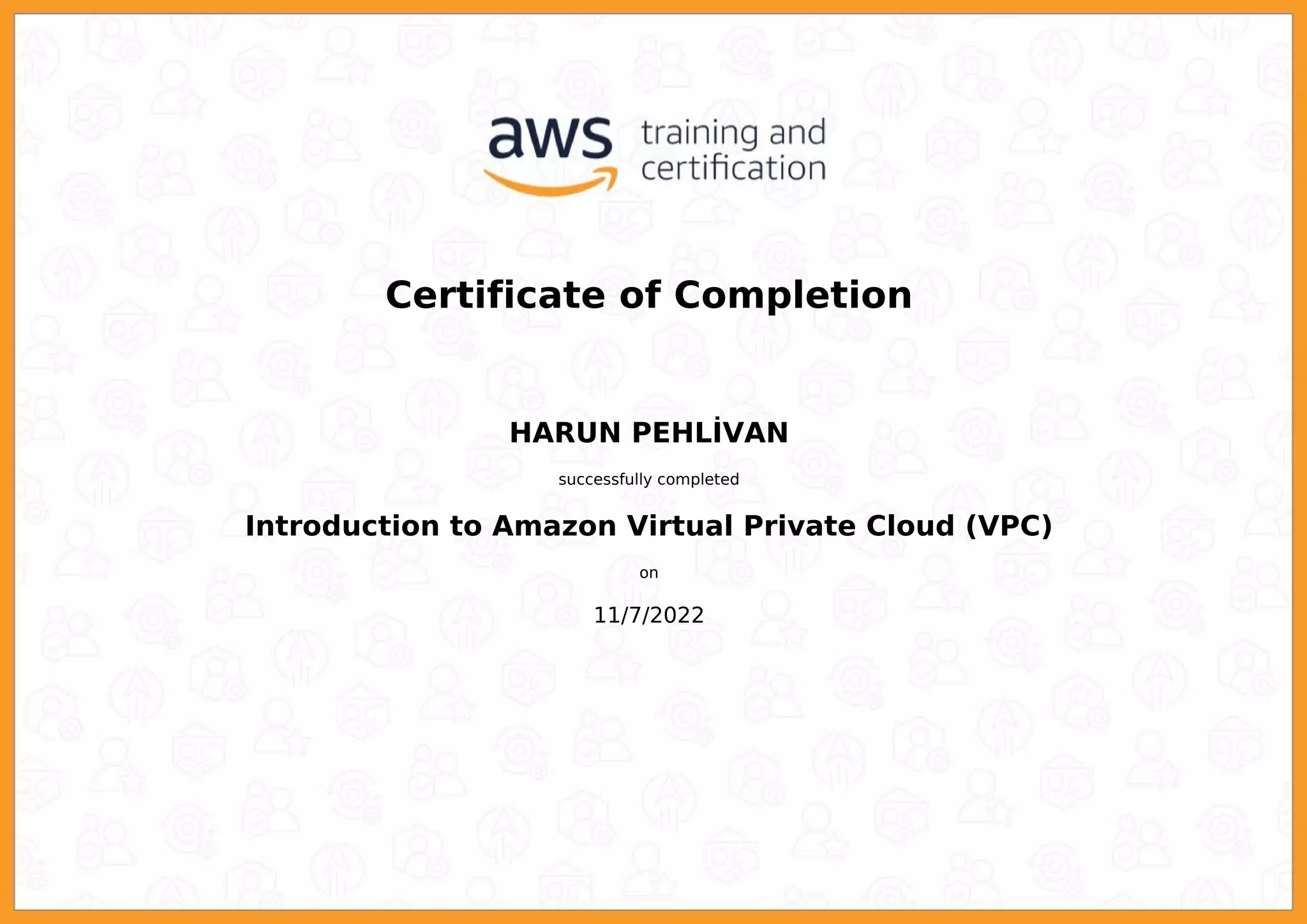 Harun Pehlivan successfully completed an Introduction to Amazon Virtual Private Cloud (VPC) course on November 7th, 2022. The certificate confirms Harun Pehlivan's completion of an introductory course focused on Amazon's Virtual Private Cloud service. It provides the date the course was completed.