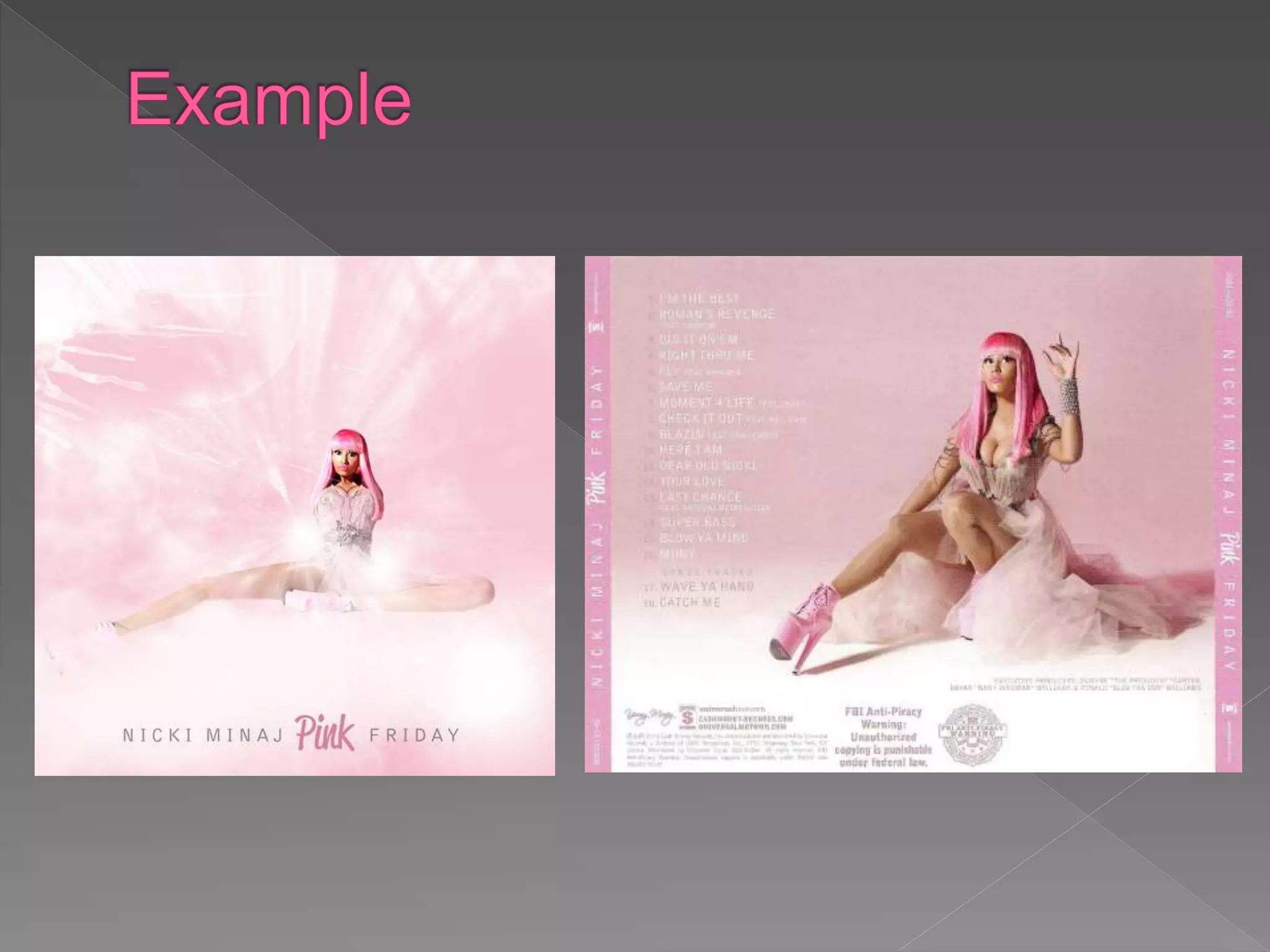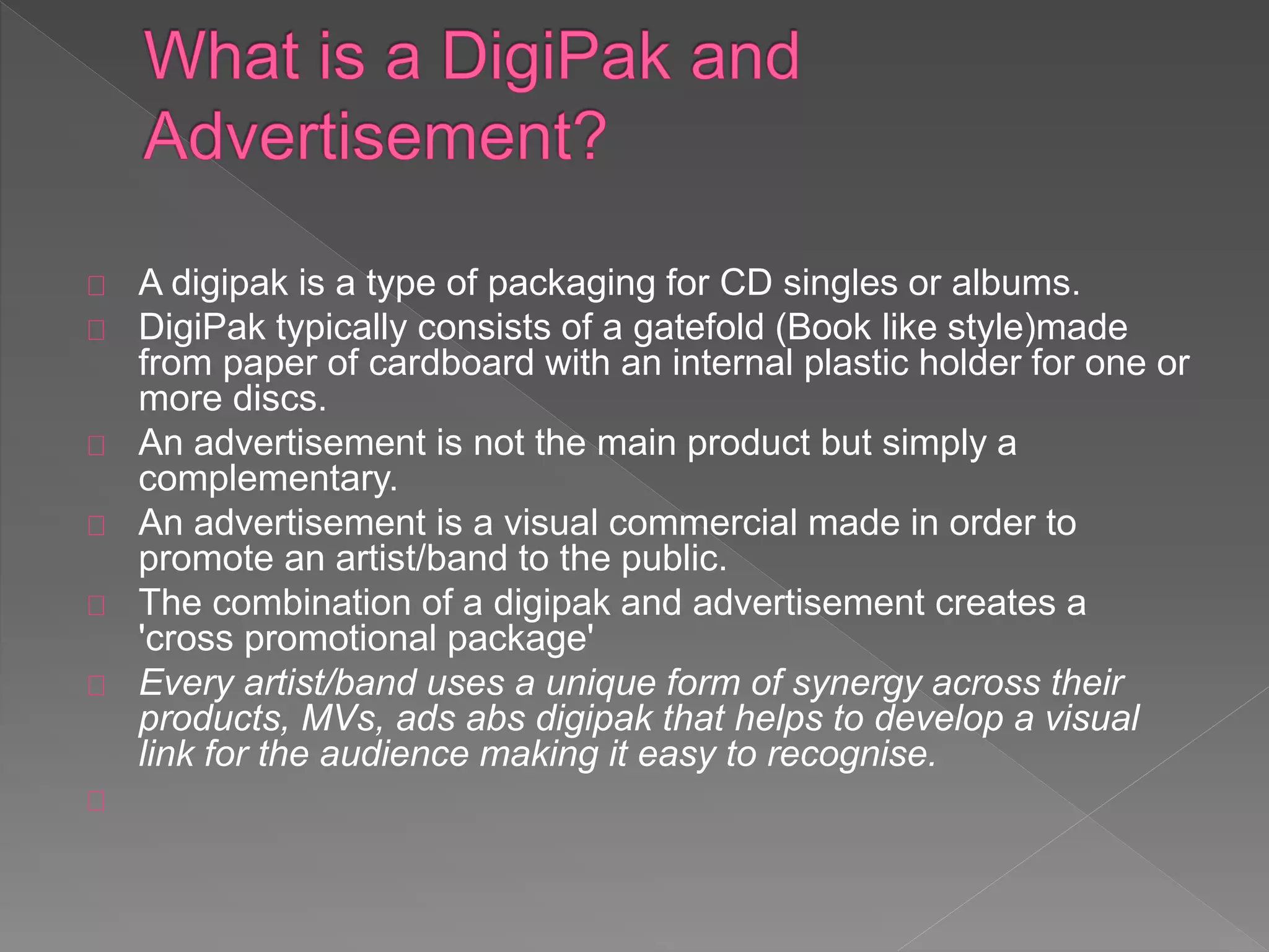 A digipak is a type of paper or cardboard packaging with a plastic holder for CDs. It has a gatefold, book-like style. An advertisement promotes an artist to the public visually, and combines with a digipak to create a cross-promotional package. Ancillary products like websites, posters, and album artwork help promote an artist's song through visual branding in various ways by working with music videos to establish a recurring theme and genre through synergy. Codes and conventions are based on media form and genre to help audiences identify and become familiar with different genres.