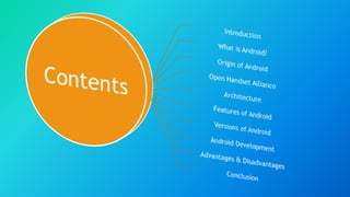 Android is an open-source, Linux-based operating system developed by Google and the Open Handset Alliance for use in mobile devices. It was originally developed by Android Inc., which was purchased by Google in 2005. The first Android device was launched in 2008. Key aspects of Android include its open nature, use of Java for application development, and features like a touchscreen interface, accelerometer, and access to the Android Marketplace.