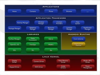 Android is an open source operating system based on Linux with a Java programming interface that was developed by Android Inc. and later acquired by Google in 2005; it uses components like activities, services, intents and fragments to build applications and shares data between apps through a content provider while receiving system messages through broadcast receivers. The document discusses the history and development of Android, its software stack and architecture, and resources for getting started with Android development.