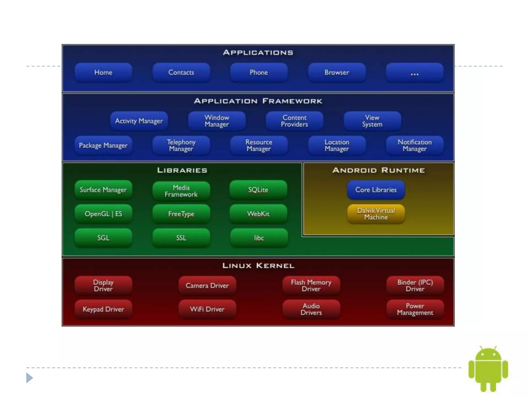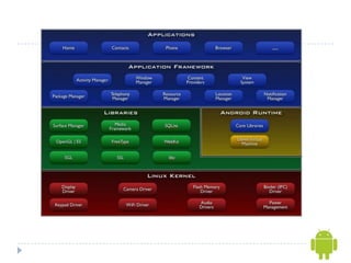 - The Android software stack consists of the Linux kernel, native libraries, Android runtime including the Dalvik VM, application framework, and applications.