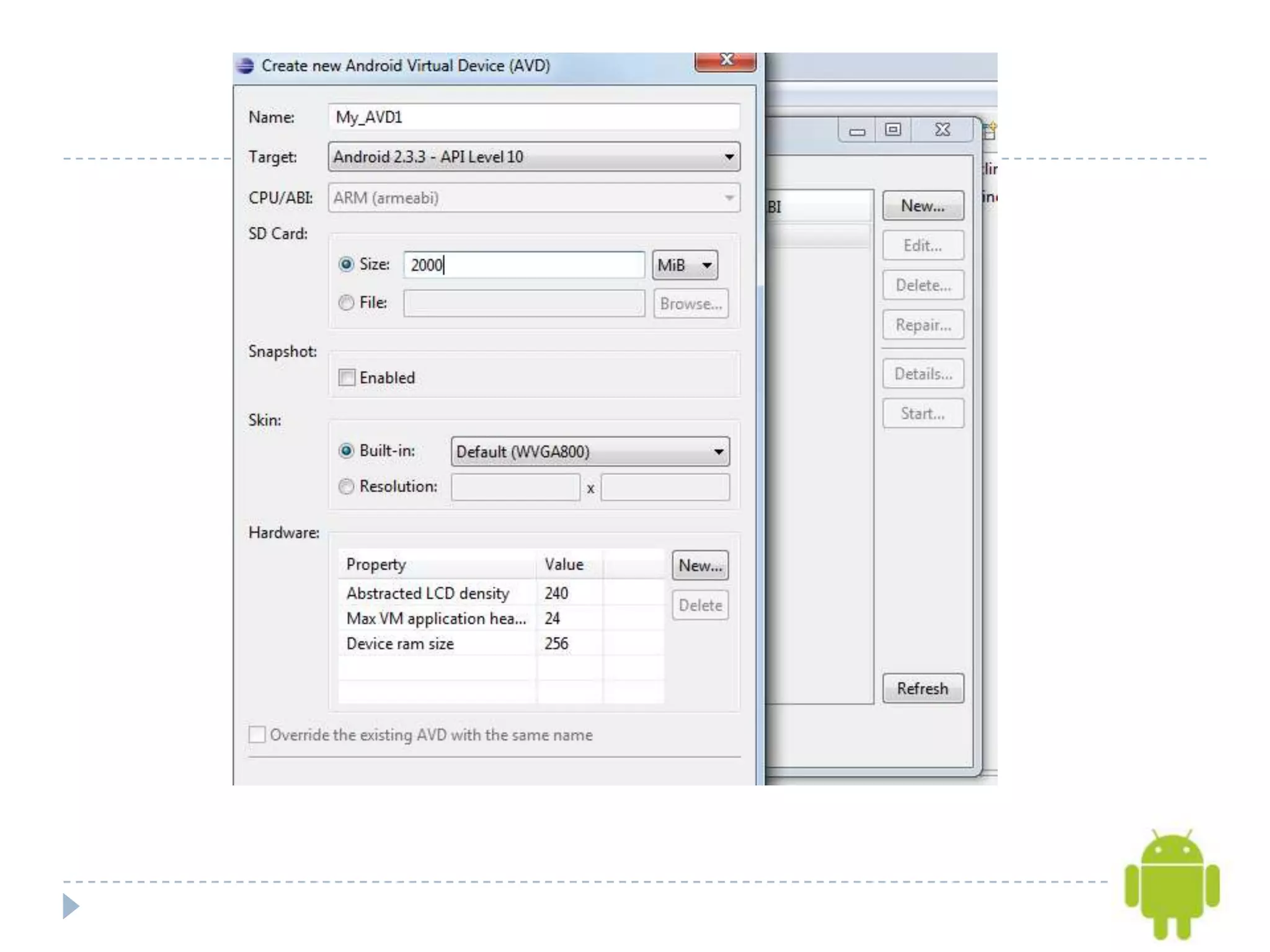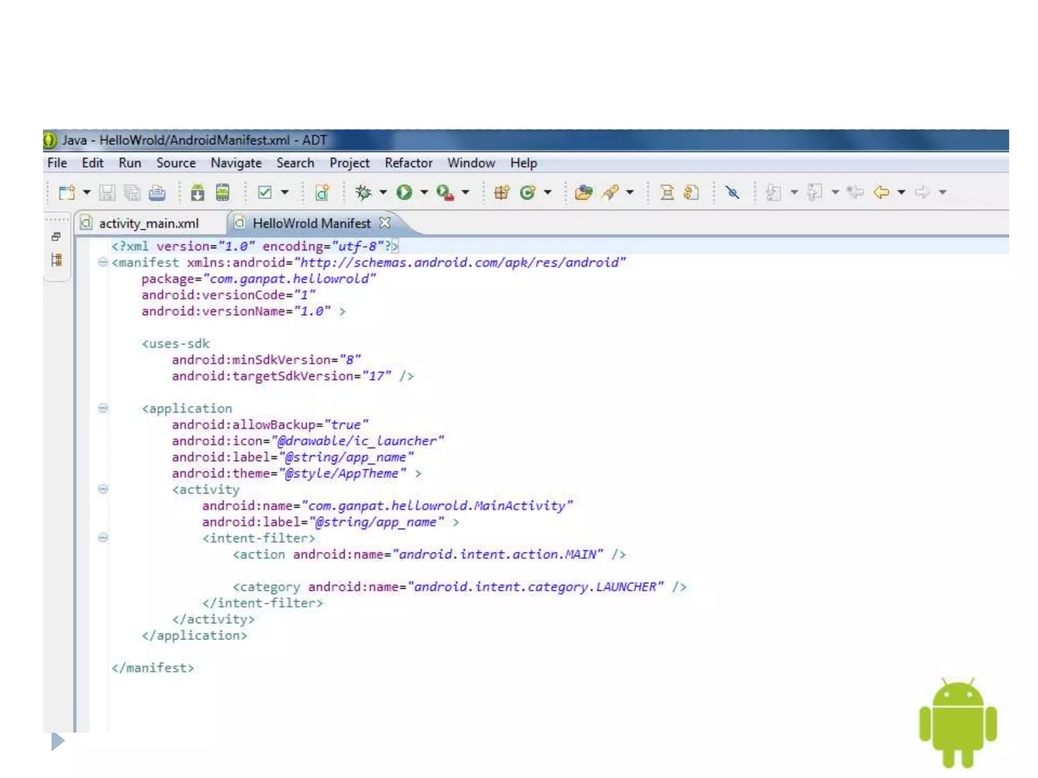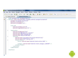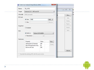 - The document outlines how to set up the Android development environment in Eclipse, including installing the SDK, ADT plugin, and creating an Android Virtual Device for testing apps.