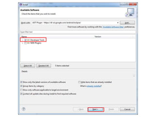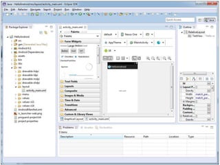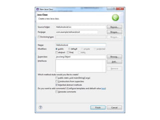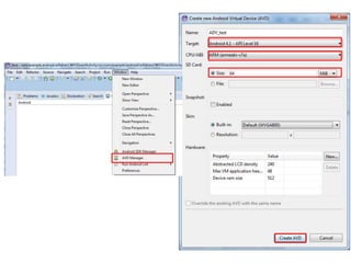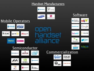 Android is an operating system for mobile devices that is developed by the Open Handset Alliance led by Google. It uses a Linux kernel with middleware, libraries and APIs written in C/C++. The Android runtime uses the Dalvik virtual machine and Java core libraries. Applications are developed using the Android SDK and written in Java. The document provides details on the architecture including system components like activities, services, content providers and intents. It also covers topics like sensors, media recording, and the Android development environment.