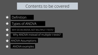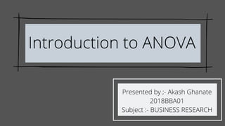 The document provides an introduction to ANOVA (Analysis of Variance), covering its definition, types (one-way, two-way, n-way), assumptions, and reasons for use over multiple t-tests. ANOVA is employed to detect differences in means among three or more groups while controlling for Type I error rates that increase with multiple t-tests. It details how varying independent variables can be analyzed simultaneously to determine statistical significance in group means.