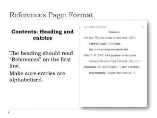 The document provides instructions for formatting references pages according to APA style. It should be headed "References" and listings should be alphabetized. Entries should have a hanging indent of 0.5 inches. Capitalization follows APA rules, such as capitalizing the first letter of the first word in titles and journal names. Examples of reference formats are provided for journal articles, books, newspapers, and electronic sources.