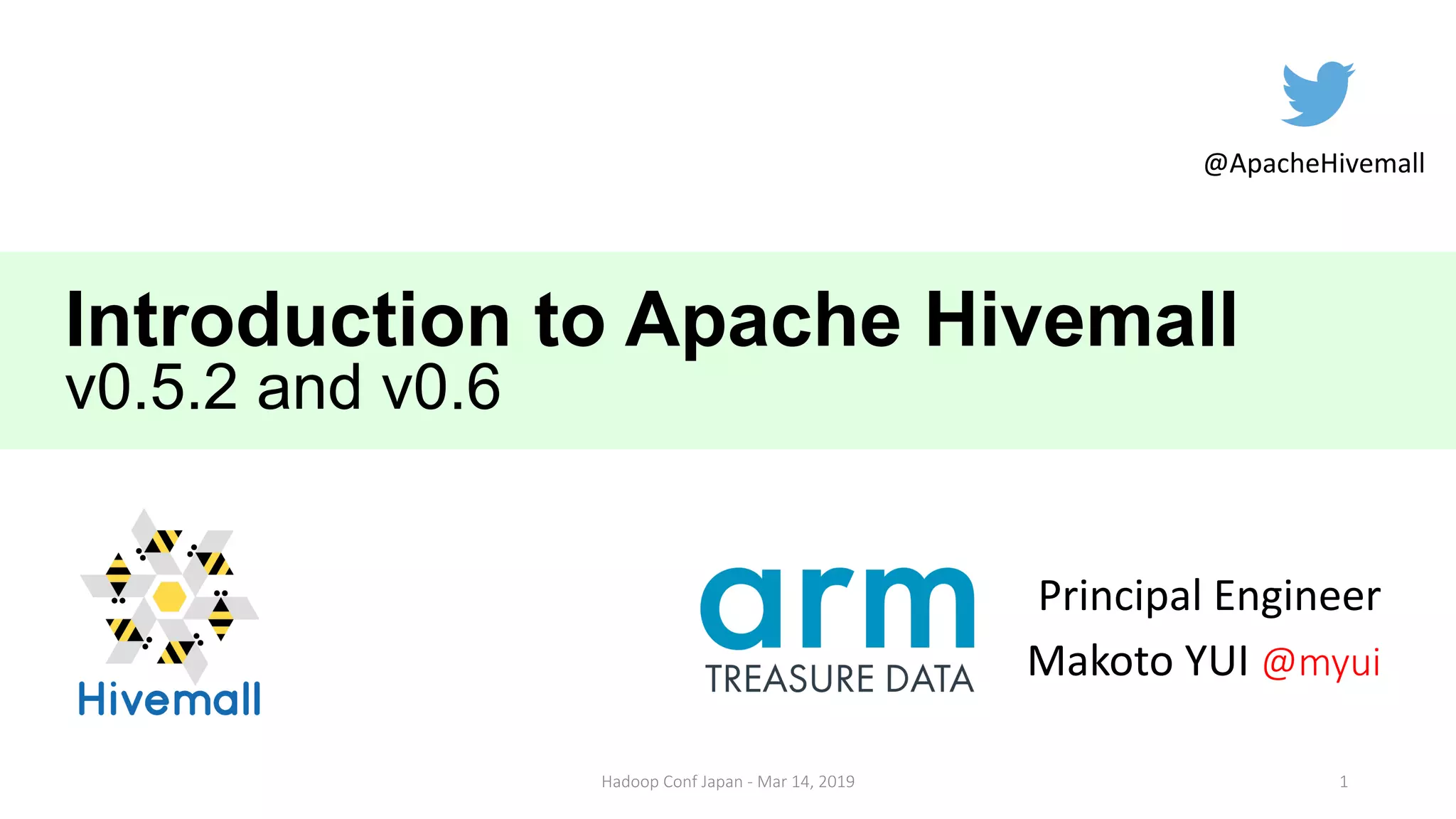 Introduction to ApacheHivemall v0.5.2 and v0.6 Principal Engineer Makoto YUI @myui @ApacheHivemall 1Hadoop Conf Japan - Mar 14, 2019