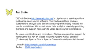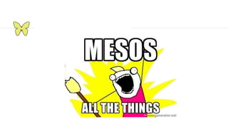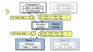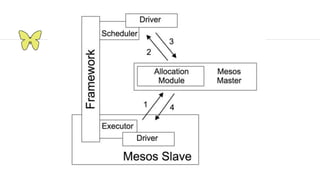 This document provides an introduction and overview of Apache Mesos. It begins by describing Mesos' origins at companies like Google and how it enables fine-grained resource sharing in data centers. It then discusses concepts like schedulers, executors, frameworks and how Mesos allows building distributed applications and data center infrastructure. The document also covers Mesos concepts such as resources, attributes, roles, constraints and how tools like Marathon interact with Mesos. Finally, it provides examples of Mesos frameworks for technologies like Kafka and Cassandra.