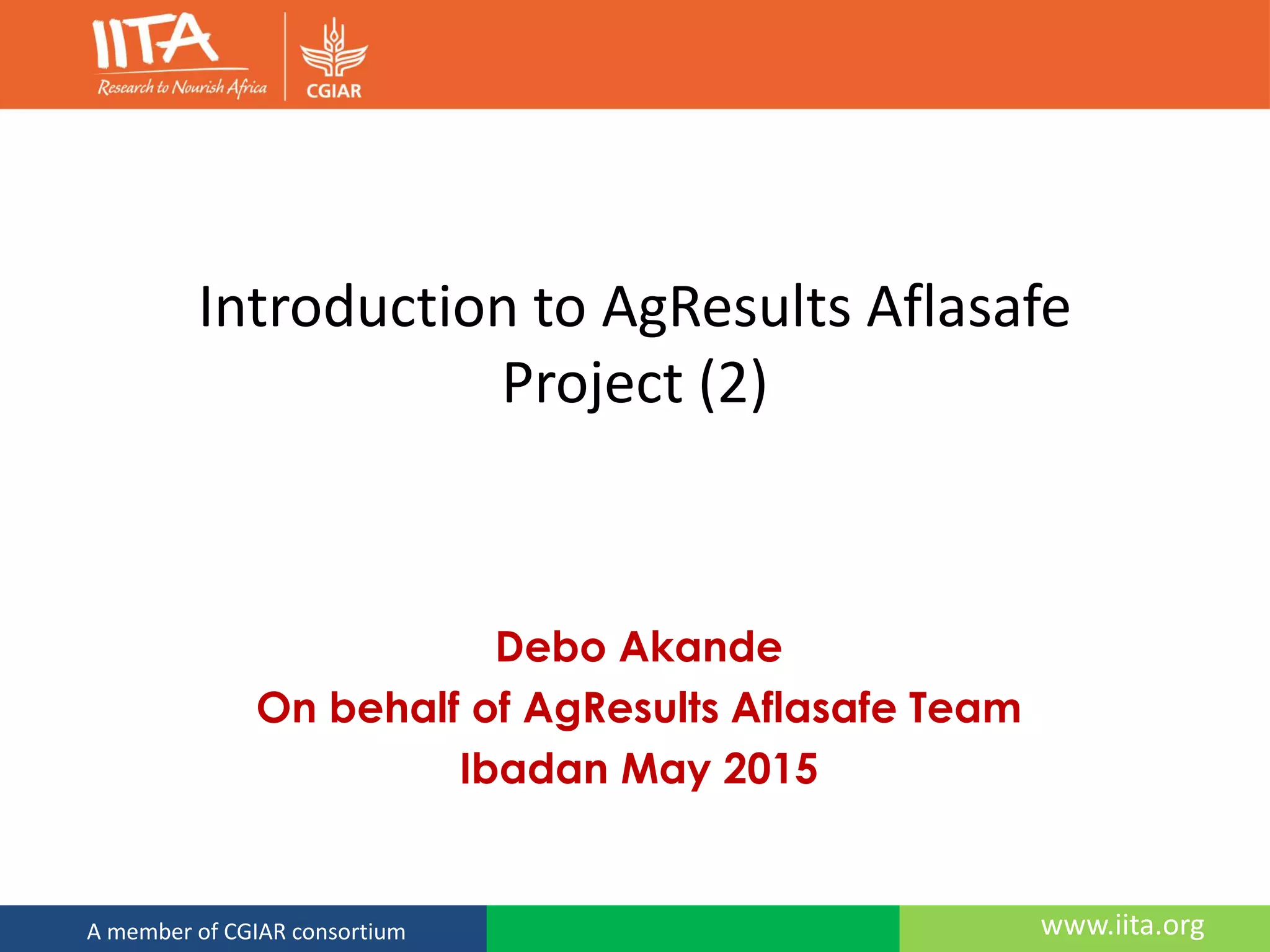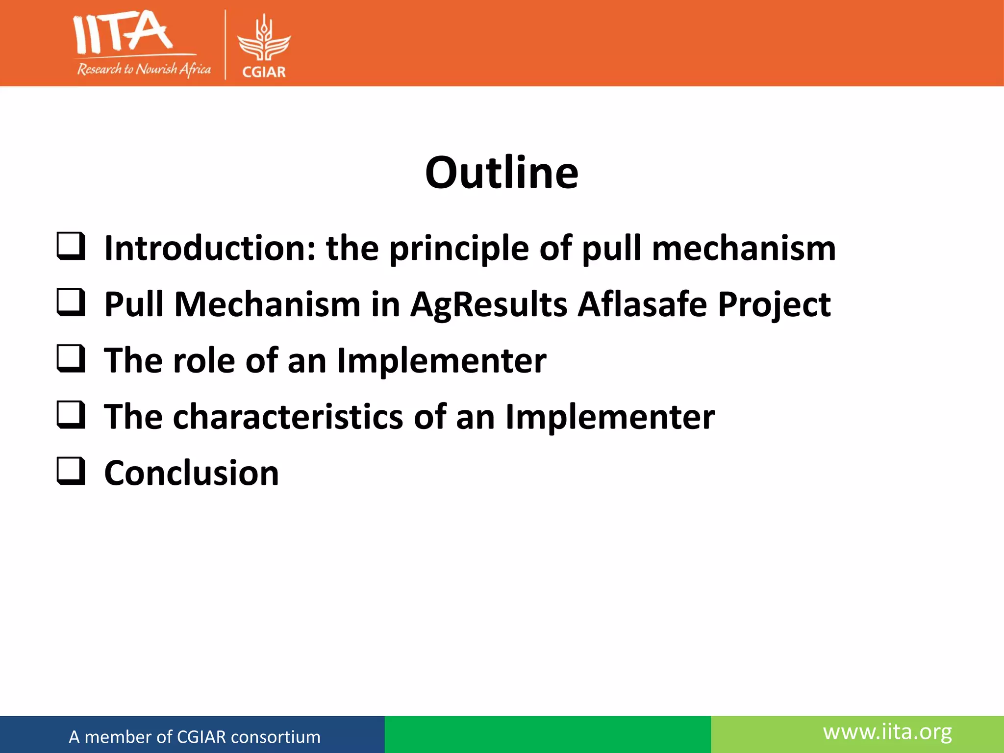 The document introduces the AgResults Aflasafe Project, which uses a "pull mechanism" to incentivize private sector investment in reducing aflatoxin in maize. The project will provide payments of $18.75 per metric ton of maize with high Aflasafe levels to approved "implementers" who work with smallholder farmers. Implementers must aggregate and market over 300 farmers' aflatoxin-reduced maize crops, provide technical support, and meet verification requirements to qualify for performance payments under the project's pull mechanism.
