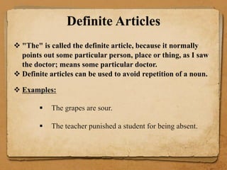 The document discusses definite and indefinite articles. It defines articles as words that limit or modify nouns to show if you are referring to a specific noun or noun in general. The indefinite articles "a" and "an" are used for indefinite or unspecified nouns, with "a" preceding consonant sounds and "an" preceding vowel sounds. The definite article "the" specifies a particular noun.