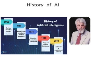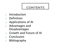 This document provides an overview of artificial intelligence (AI). It begins with definitions of intelligence and AI. It then discusses the central principles of AI, including reasoning, knowledge, planning, learning, communication, perception and manipulation. Applications of AI discussed include healthcare, music, scheduling, robotics, gaming and finance. Advantages include more powerful computers and interfaces, while disadvantages include costs and software challenges. The document concludes that as biological intelligence is fixed, AI provides an exponentially growing new paradigm and will change the world. It received citations.