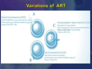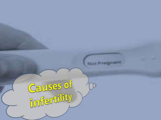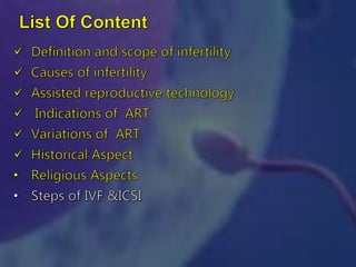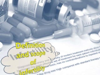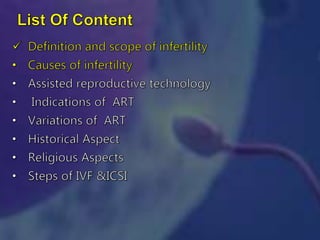 Infertility is defined as the failure to achieve a clinical pregnancy after 12 months of regular unprotected intercourse. It affects approximately 9-15% of reproductive-aged couples worldwide. The main causes of infertility include female factors like PCOS, endometriosis, and tubal damage; male factors like low sperm count or quality; and unexplained infertility. Treatments for infertility include ovulation induction, intrauterine insemination, in vitro fertilization, and others. Religious views on assisted reproduction vary between religions, with some being more accepting than others.