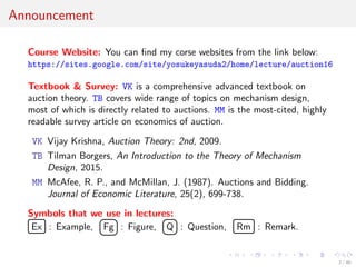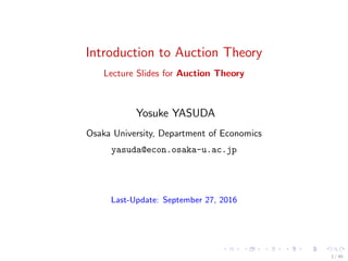 The document comprises lecture slides on auction theory by Yosuke Yasuda from Osaka University, focusing on key concepts such as the independent private values model, conclusions by Milgrom and Weber, and the principal-agent model. It outlines various auction mechanisms, the equivalence of auction forms, revenue maximization strategies, and insights into Bayesian games and the revelation principle. Overall, the lecture emphasizes the mathematical foundations and strategic considerations underlying auction theory and economic mechanisms.