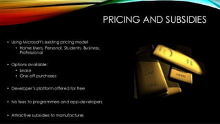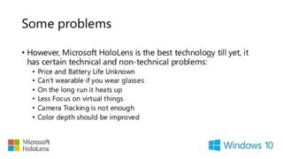 The document discusses augmented reality (AR), virtual reality (VR), and holograms. It then describes Microsoft's HoloLens headset, which allows the user to see holograms overlaid on the real world. The HoloLens combines advanced processing with untethered use, and will run on Windows 10 with specialized apps for areas like gaming, design, education, and more. The conclusion is that the HoloLens represents a revolutionary breakthrough that is well-suited for the future of computing.