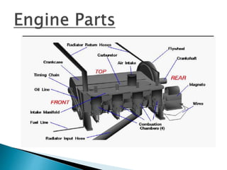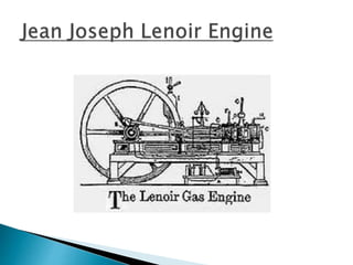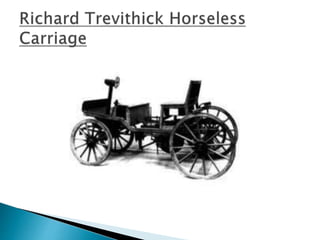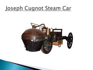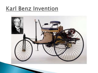The document discusses the history and development of automobiles. It describes how early vehicles were powered by steam engines but that Karl Benz is credited with building the first practical automobile powered by an internal combustion engine in 1885. It then discusses major innovations and components of modern automobiles, including engines, transmissions, and other systems like braking, suspension, and electrical. It focuses on the engineering advances that have made cars simpler to operate and more efficient over time.