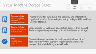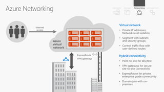 Azure provides Infrastructure as a Service (IaaS) through a global network of data centers. It offers virtual machines, storage, networking, and other core services to deploy and manage applications and infrastructure. Azure provides options for compute, storage, and virtual networking to suit different application needs. It also offers security, management, and backup services to help secure and monitor workloads in Azure.