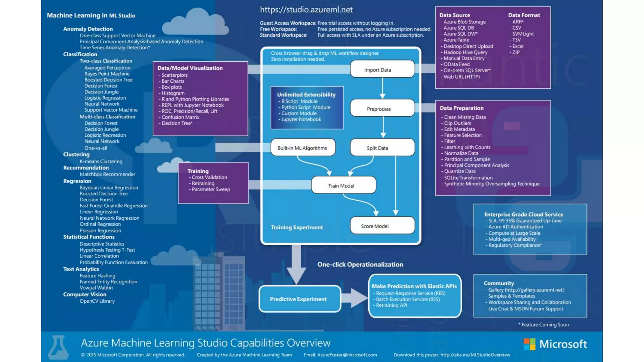 The document provides an overview of Azure Machine Learning, a fully managed cloud service designed for building and operationalizing machine learning models. It covers topics such as the interface of the machine learning studio, components of an experiment, and a demo illustrating the process of predicting automobile prices. Key features include a drag-and-drop interface, support for popular algorithms, and tools for effortless model operationalization.