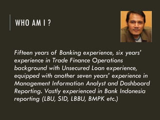 Dokumen ini memberikan ringkasan tentang latar belakang penulis yang memiliki pengalaman 15 tahun di bidang perbankan, termasuk di bidang operasional trade finance dan manajemen informasi. Dokumen ini juga menjelaskan aturan-aturan kelas dan evaluasi penugasan, serta penugasan kelas sebelumnya tentang alasan pemerintah menyelamatkan bank yang hampir bangkrut dan perubahan peraturan perbankan Indonesia.