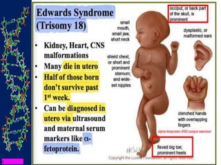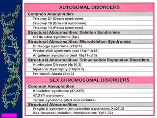 This document provides an overview of cytogenetics, which is the study of chromosomes and their role in heredity and disease. It discusses key cytogenetics concepts like karyotyping, different types of chromosome abnormalities including deletions, duplications, inversions, and translocations. It also describes common aneuploidy disorders caused by nondisjunction during meiosis like Down syndrome (trisomy 21) and Edwards syndrome (trisomy 18). The goal of cytogenetic analysis is to diagnose chromosomal abnormalities and locate abnormal chromosomal regions/DNA sequences.
