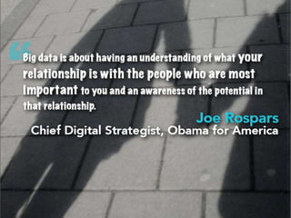 The document provides a comprehensive overview of big data, including its definition, characteristics, and management tools like Hadoop. It discusses the challenges posed by traditional data management methods and highlights practical use cases for big data across various organizations. The concluding section emphasizes the significance of big data in modern decision-making and business strategies.