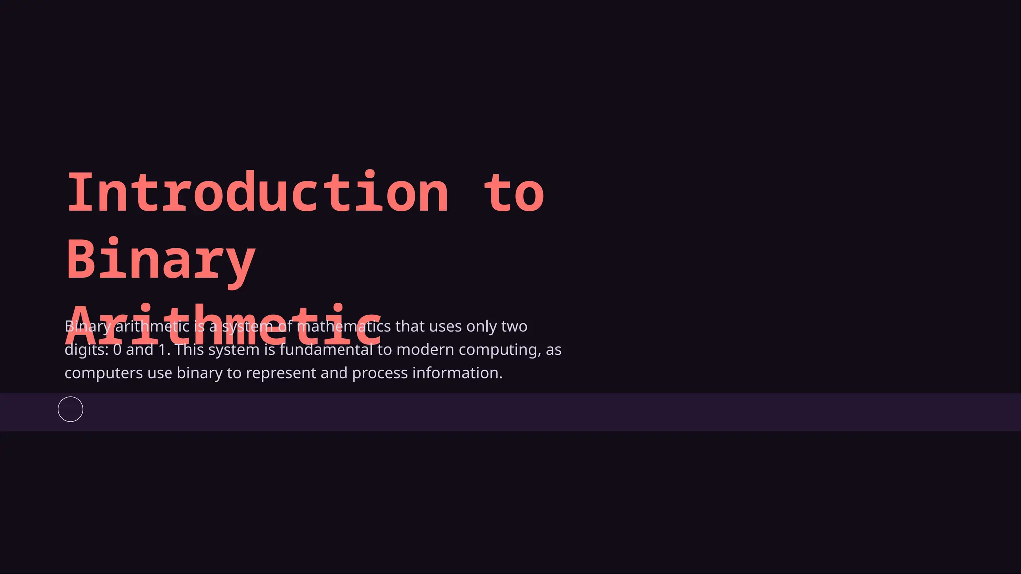 The document explains binary arithmetic, a mathematical system using only 0 and 1, which is essential for modern computing. It covers fundamental concepts including place values, binary operations (addition, subtraction, multiplication, and division), and practical applications such as digital computers and data storage. Understanding binary arithmetic is crucial for anyone interested in computing technology.