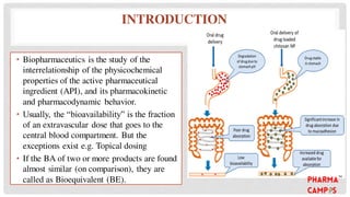 Bioavailability refers to the fraction of an extravascular dose reaching systemic circulation, impacted by factors such as drug solubility and permeability. The Biopharmaceutical Classification System (BCS) categorizes drugs into four classes based on their solubility and absorption characteristics, aiding in the development of strategies to improve bioavailability. Bioavailability studies aim to evaluate new drug entities, the influence of excipients, and the effects of various patient-related and processing factors.
