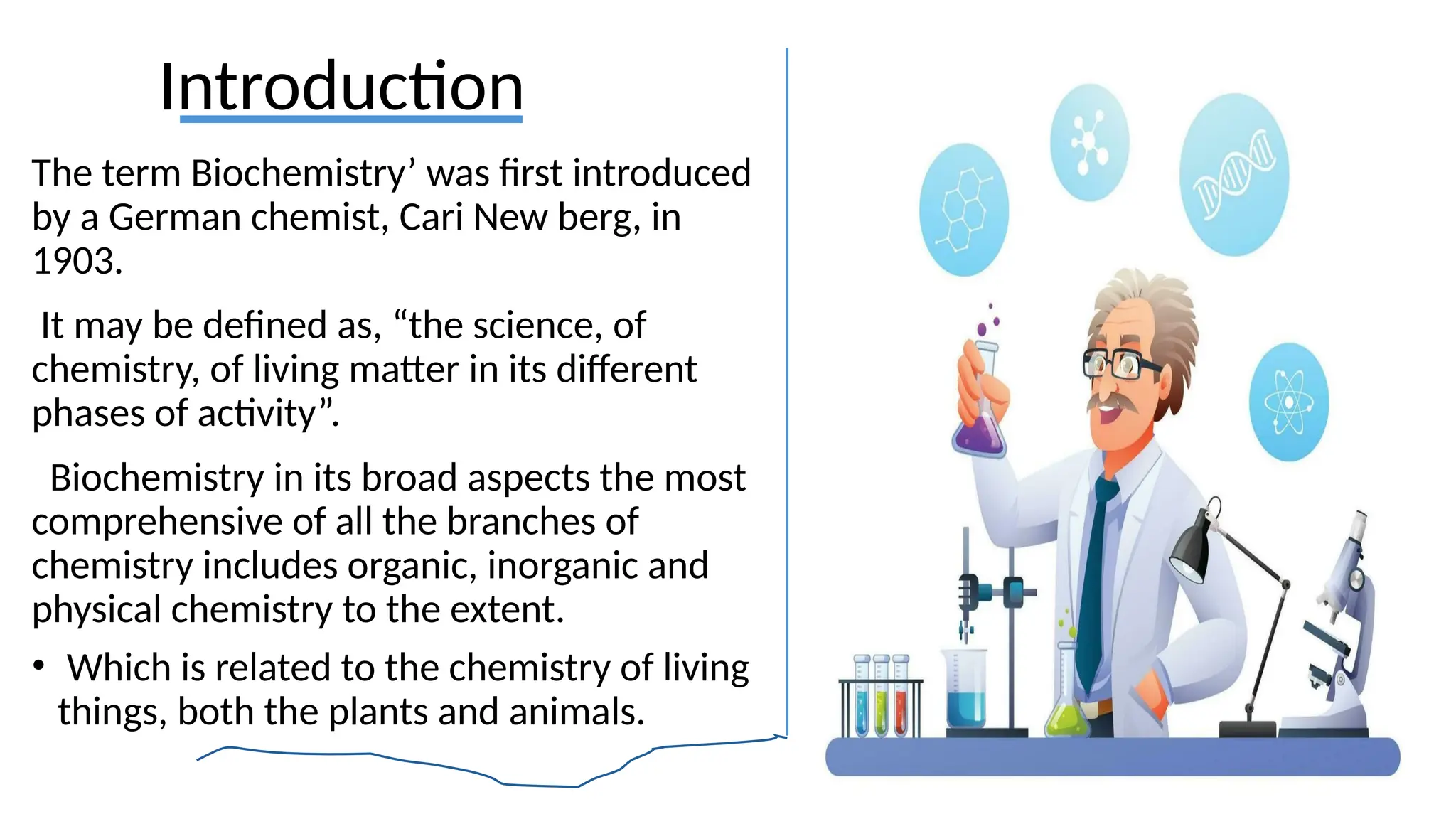 It begins by defining biochemistry as the science concerned with the chemical nature of living matter. Biochemistry has two branches-descriptive biochemistry which qualitatively and quantitatively characterizes cell components, and dynamic biochemistry which elucidates the nature and mechanisms of reactions between these components.