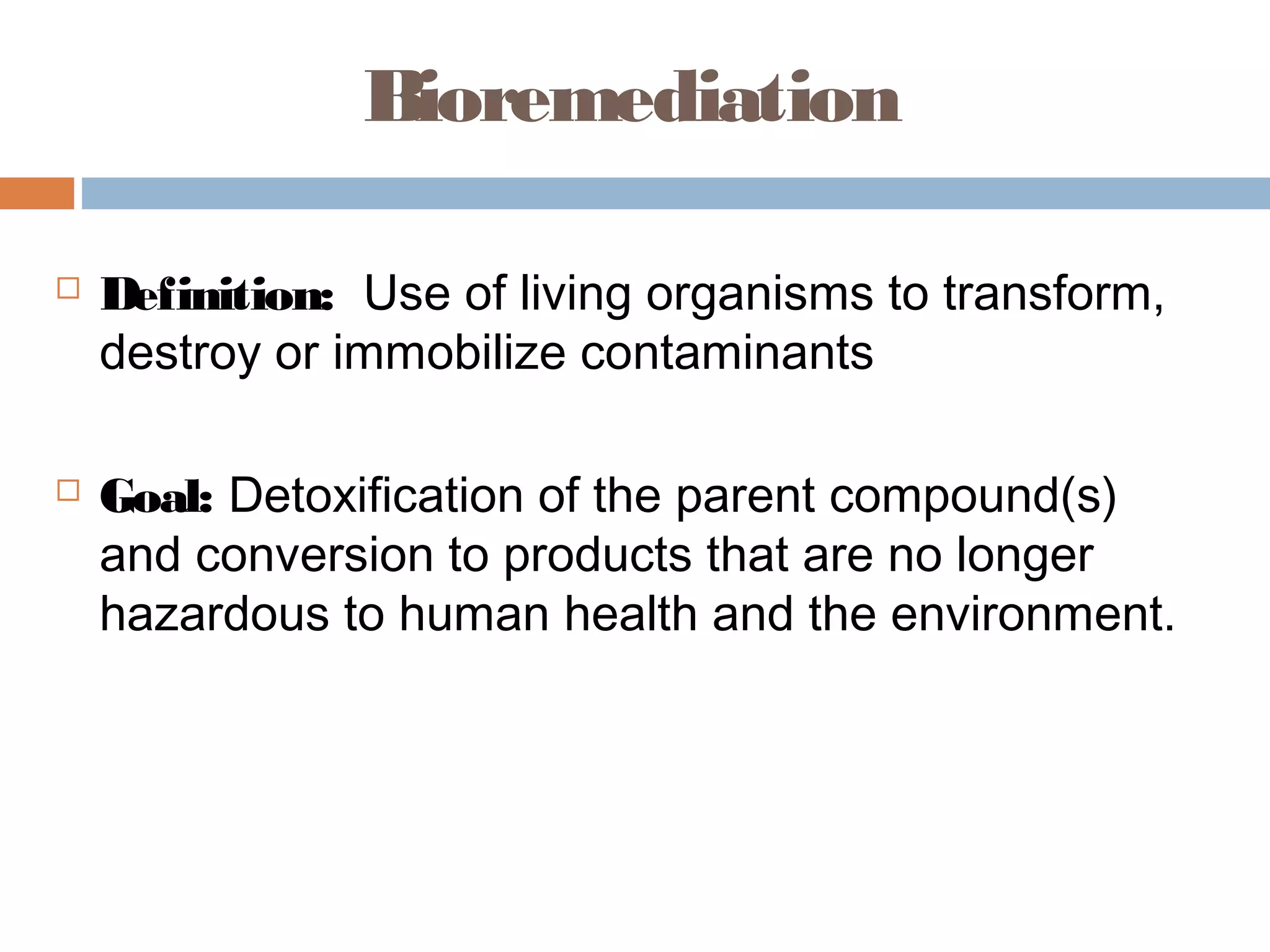 Bioremediation is the use of living organisms to detoxify and convert hazardous contaminants into safer products for human health and the environment. It occurs in two forms: in situ, treating contamination at the site, and ex situ, removing and treating it elsewhere, with various methods like bioventing, composting, and biopiles. Techniques include using indigenous microorganisms to enhance biodegradation through processes like biosparging and bioaugmentation, with varying advantages and limitations depending on the method and the contaminated site.