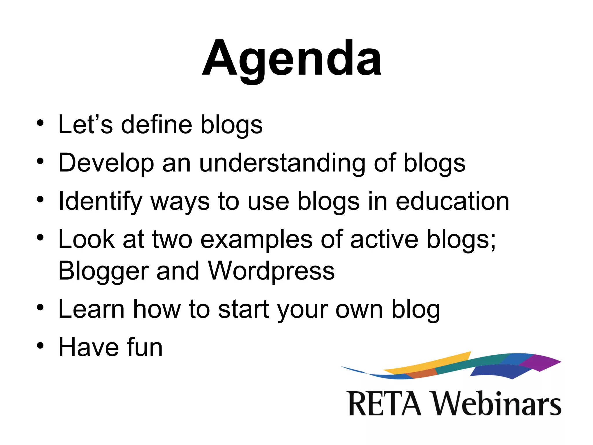 This document provides an introduction to blogging basics and how blogs can be used in education. It defines what a blog is, explains the different types of content that can be included in blogs, and lists some ways that blogs can be used in educational settings, such as for content, networking, instructional tips, announcements, reflections, assignments, and sharing resources. It also discusses some of the benefits of blogging in the classroom, like giving writing purpose and involving different learning styles. Finally, it outlines some things to consider when getting started with blogging and managing a class blog.