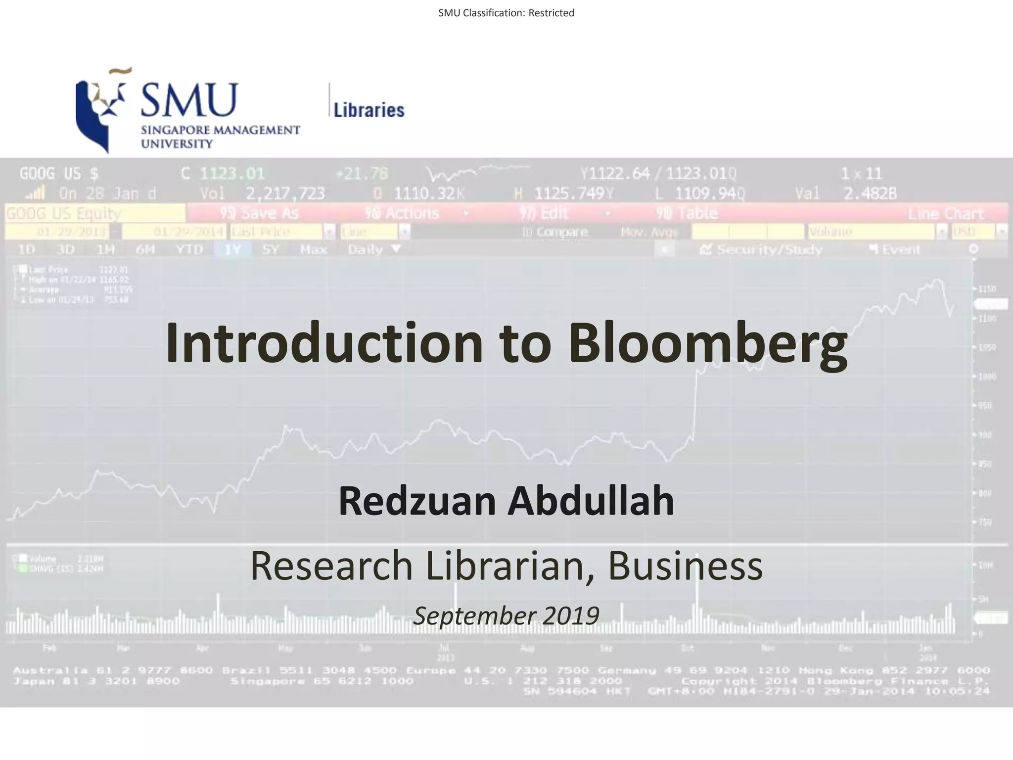 This document provides an introduction to using the Bloomberg database. It explains that Bloomberg provides real-time financial, news and economic data with a 15 minute delay for academic users. It then demonstrates how to navigate the Bloomberg keyboard and terminals to access company profiles, industry reports, conduct equity and bond screenings, and find forecasts and additional learning resources. Users are directed to contact the library for help accessing seminars or troubleshooting assistance.
