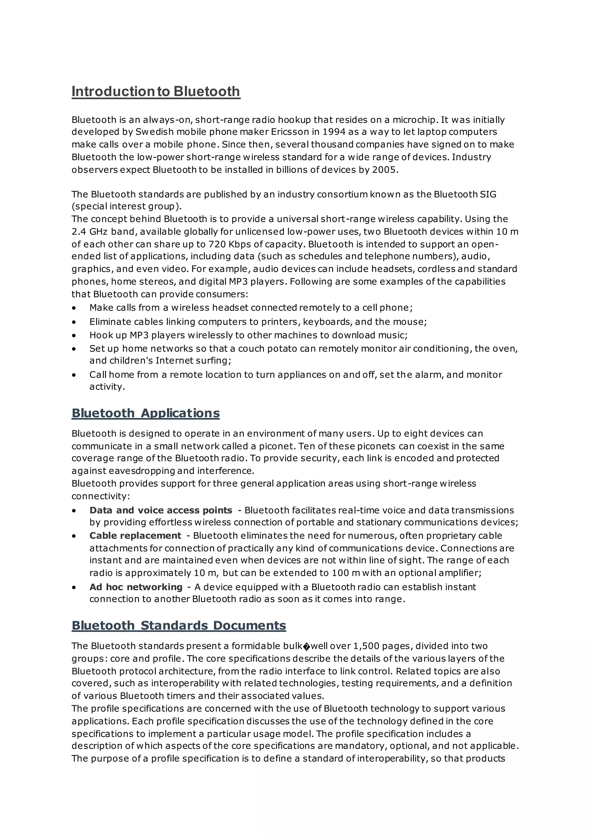Bluetooth is a short-range wireless technology that allows various electronic devices to connect and exchange information within 10 meters of each other. It was originally developed in 1994 to allow wireless connections between laptops and mobile phones. Now Bluetooth is used to connect many different types of devices wirelessly, including headphones, keyboards, printers, and more. Over time, industry standards were developed and billions of Bluetooth-enabled devices are expected to ship by 2005.