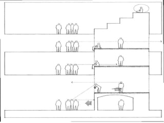 The document discusses the concept of space in architectural design, emphasizing the creation and division of space using various elements. It categorizes types of spaces, such as base planes (horizontal, elevated, depressed, and overhead), and vertical configurations (parallel, U-shaped, and four planes), detailing how these affect the perception of volume and boundaries. Factors like height, surface color, texture, and pattern are highlighted as important to the visual description and perception of space.