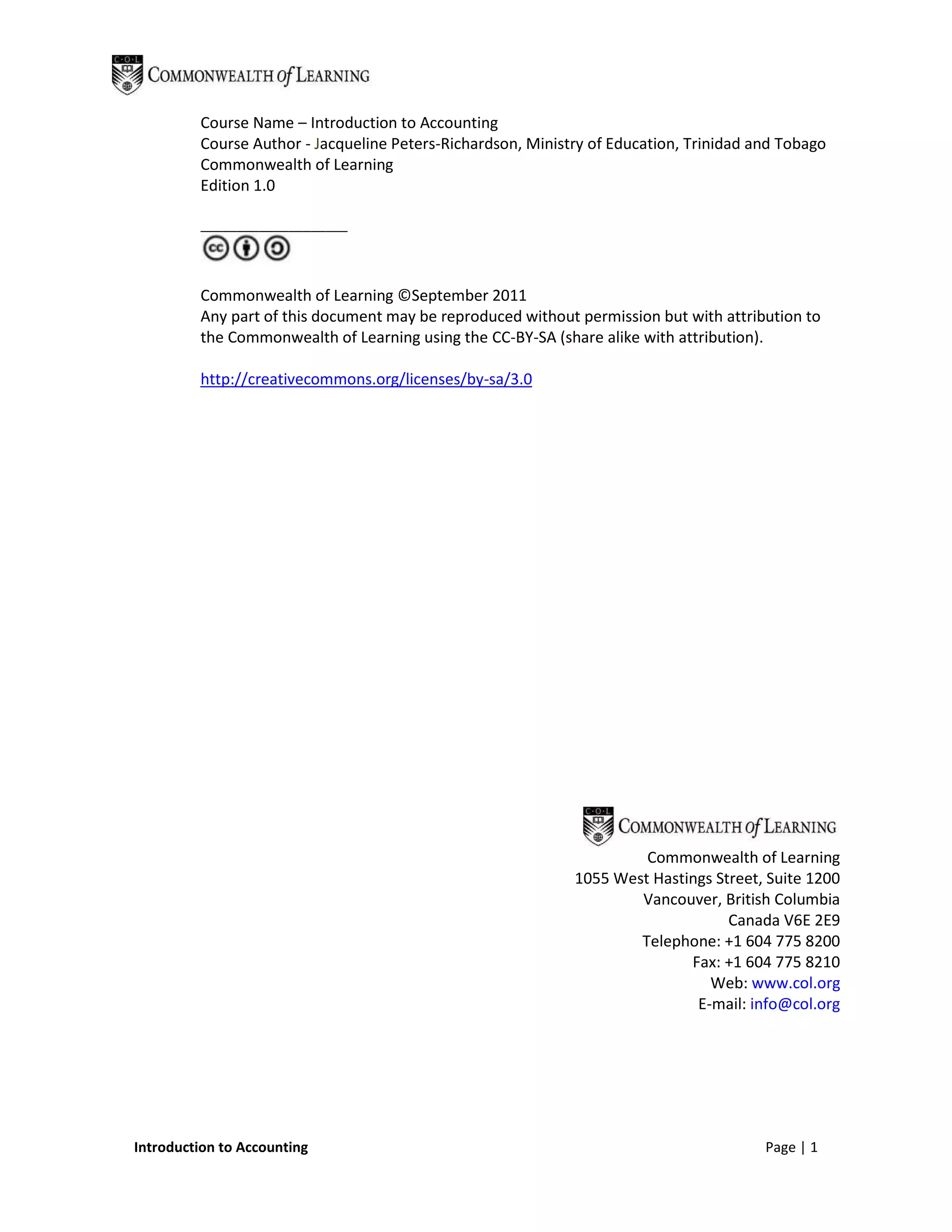 The document is a course outline for an Introduction to Accounting authored by Jacqueline Peters-Richardson, aimed at teaching fundamental accounting principles and practices to aspiring entrepreneurs. It covers essential topics such as the accounting cycle, double-entry accounting, financial statements, and the analysis of financial information. The course is structured into five units, includes assessments, and emphasizes the importance of proper financial management for business success.