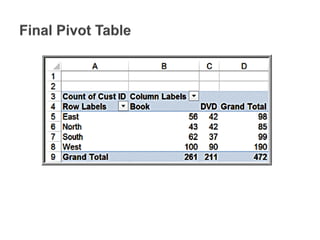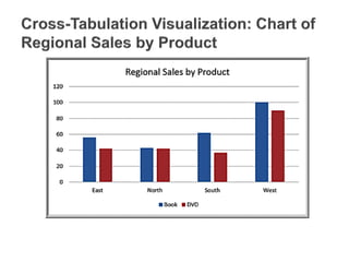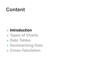 This document discusses various methods for visualizing and summarizing data. It describes different types of charts like column charts, line charts, pie charts, and scatter plots that can be used to visualize quantitative data. It also discusses tools in Excel for filtering, sorting, and summarizing data in tables and how techniques like Pareto analysis can help identify key factors.