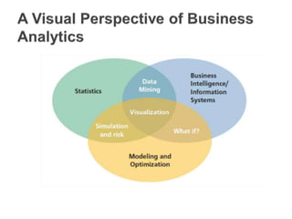 The document discusses the role of analytics in business operations, including tools and methods for data analysis, predictive modeling, and decision-making. It highlights the benefits, such as improved insights and profitability, as well as challenges like data sharing and skill deficits. Additionally, it covers the importance of understanding different types of data and the complexities of problem-solving using analytics.