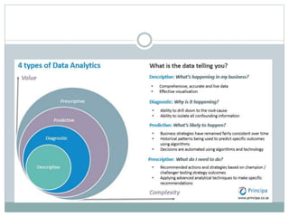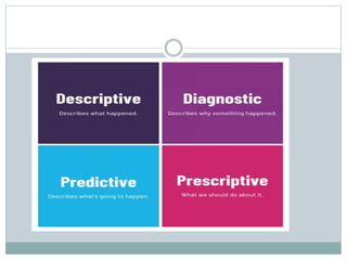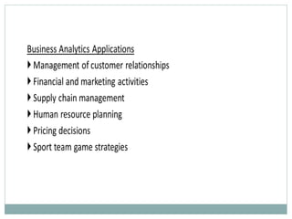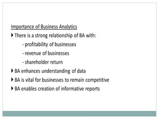The document discusses the fundamentals of business analytics, emphasizing its role in transforming raw data into actionable insights for improved decision-making. It covers various fields of analytics, including descriptive, predictive, and prescriptive analytics, as well as the significance of analytical tools in optimizing business performance and minimizing risks. The content highlights the evolution of business analytics since the 1970s and explores the differences between business analysis and business analytics.