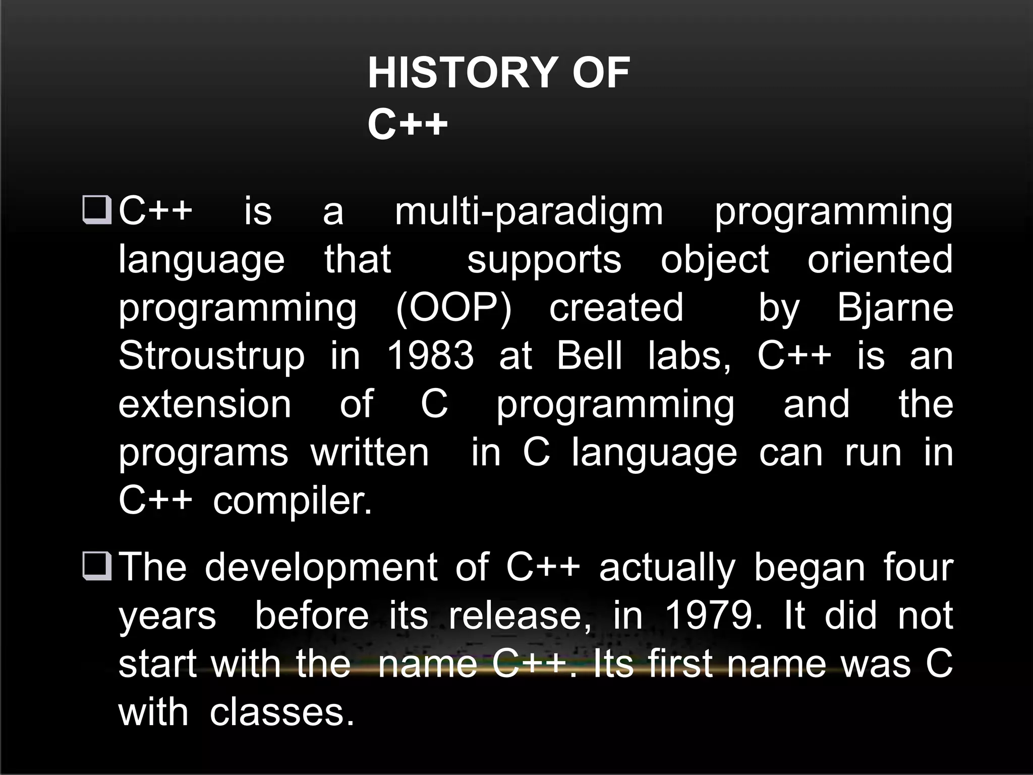The document provides an overview of the C++ programming language. It discusses the history and development of C++, with key points being that C++ was created by Bjarne Stroustrup in 1983 as an extension of C to support object-oriented programming. It then covers some of the main differences between C and C++, uses of C++, advantages and disadvantages, standard libraries, basic C++ structures like data types, variables, operators, functions, arrays, and pointers.