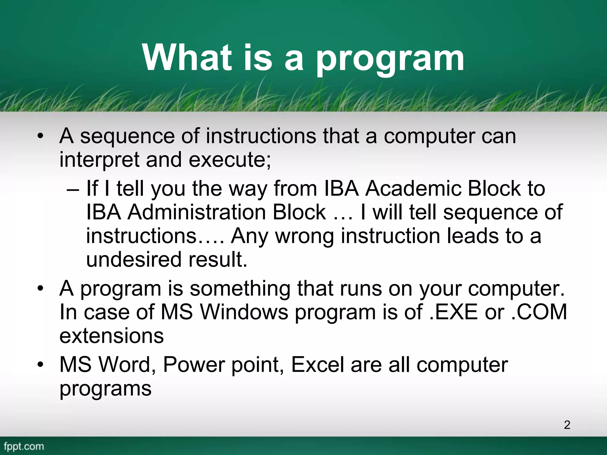 This document provides an introduction to programming in C++. It explains that a program is a sequence of instructions that a computer can interpret and execute. C++ is a general-purpose, compiled programming language that supports procedural, object-oriented, and generic programming. It was developed in 1979 as an enhancement to the C language. The document outlines the basic elements of a C++ program, including preprocessor directives, header files, functions, return statements, and data types. It also discusses setting up the environment, writing and compiling a simple "Hello World" program, and the roles of editors, compilers, and linkers.