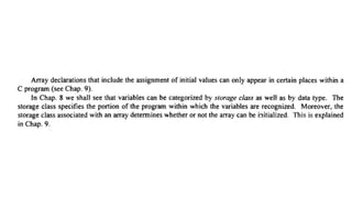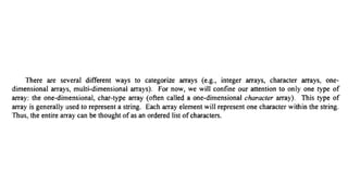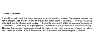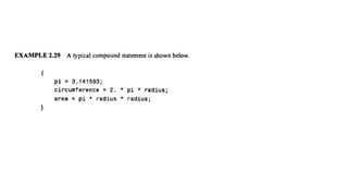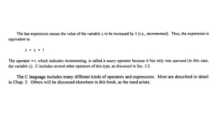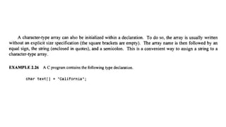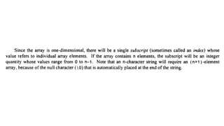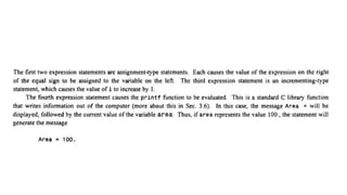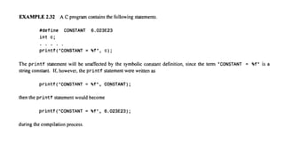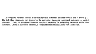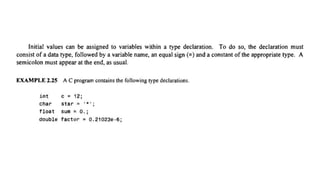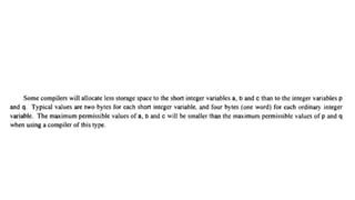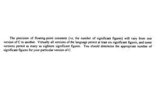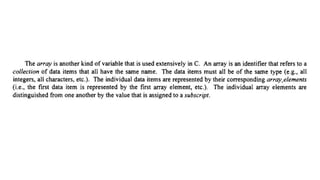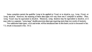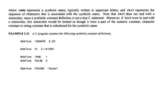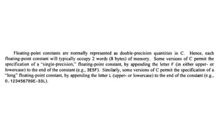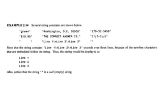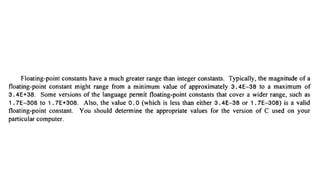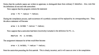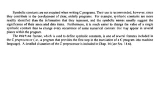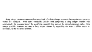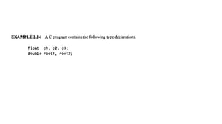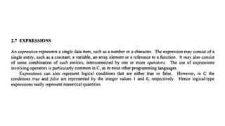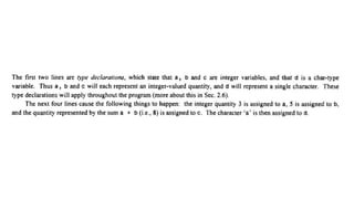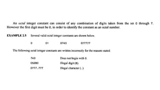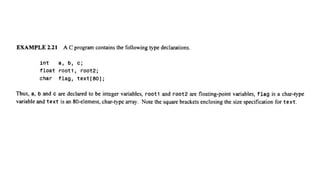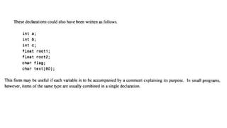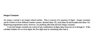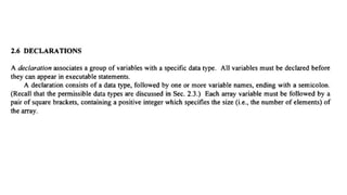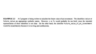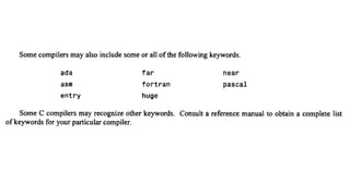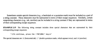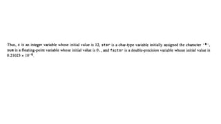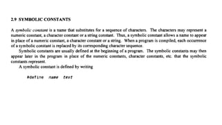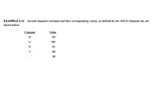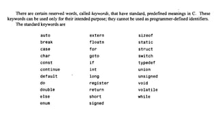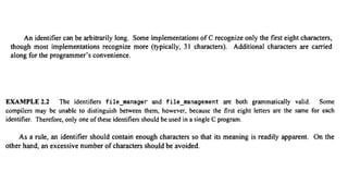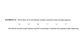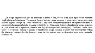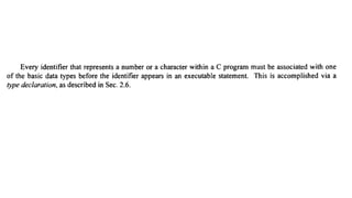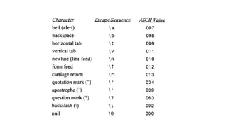 The document provides an introduction to programming fundamentals in C, focusing on the character set, including escape sequences and rules for identifiers. It explains that identifiers must start with a letter and can include letters, digits, and underscores while maintaining case sensitivity. It also briefly mentions data types, constants, and variables.