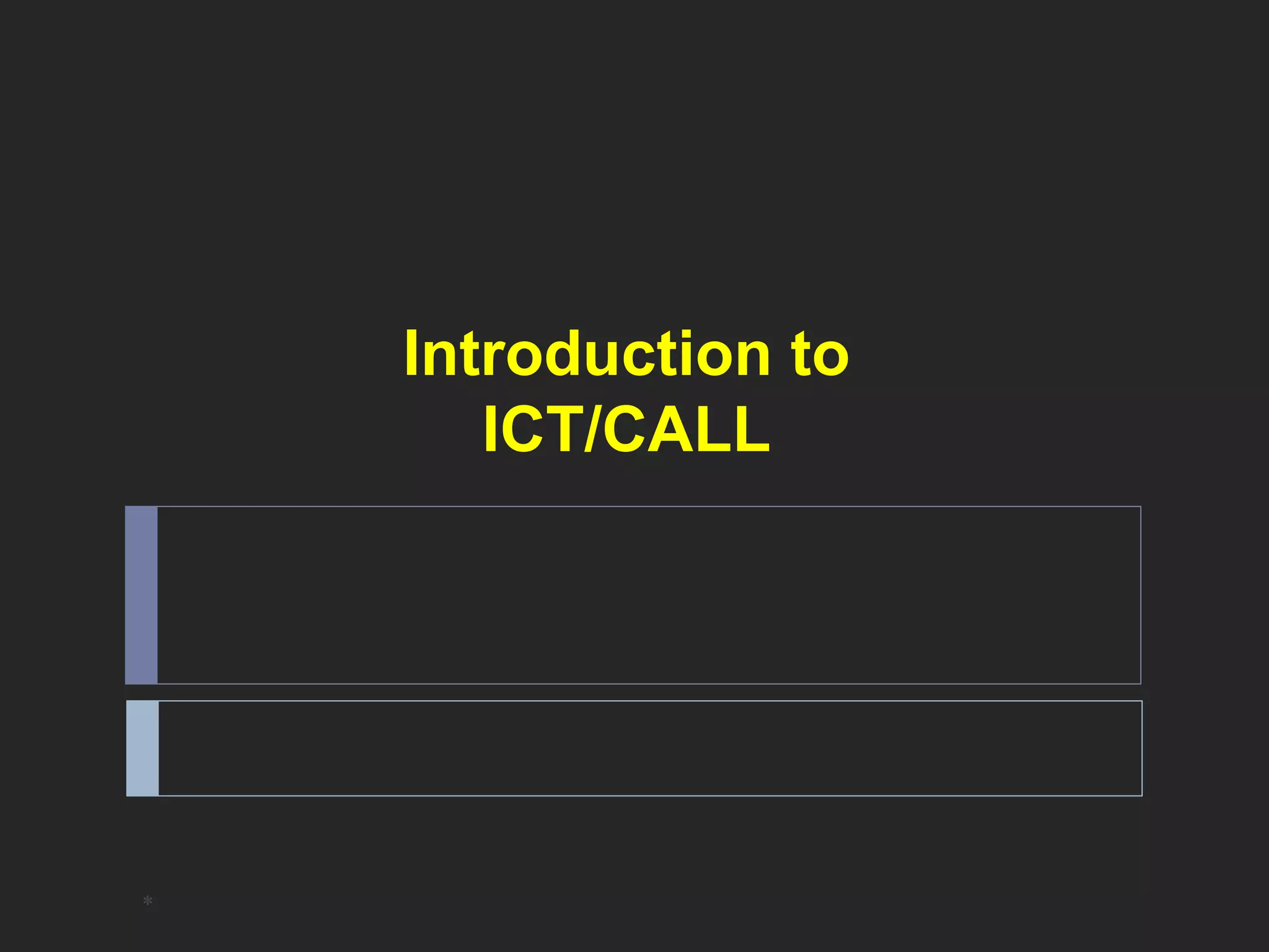 This document provides an introduction to ICT (Information and Communication Technology) and CALL (Computer-Assisted Language Learning). It defines the terms and discusses how CALL has evolved from mainly focusing on drills to more communicative and interactive approaches using newer technologies. It highlights how CALL has progressed from being text-based on mainframes to utilizing multimedia and the internet. The document concludes by listing some random tips for working with ICT/CALL, emphasizing the importance of problem-solving skills, pedagogical creativity, and keeping up with new technologies.