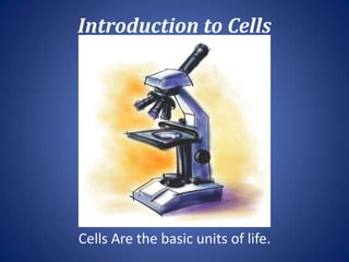 Cells are the basic units of life and share seven key characteristics with all living things. These characteristics include requiring food for energy, respiration to break down food for energy, responding to the environment, producing waste, ability to repair themselves, growth and reproduction, and a limited lifespan. The document provides an introduction to cells as the building blocks of life and outlines the seven traits that all cells and living things possess.