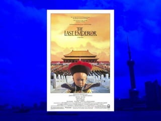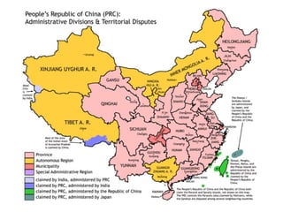 The document provides a historical overview of China from ancient times to the present day. It summarizes the major dynasties and periods of Chinese history, including the imperial era, ancient inventions, aborted commercial revolution, opium wars, decline of the imperial era, republican revolution, warlord era, nationalist and communist movements, establishment of the People's Republic of China under Mao Zedong, post-Mao economic reforms under Deng Xiaoping, Tiananmen incident, and current leadership under Hu Jintao.