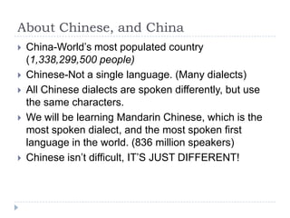 This document provides an overview of the Chinese language and culture. It discusses that China has the world's largest population and that Mandarin Chinese is the most widely spoken first language. While Chinese dialects differ in pronunciation, they use the same characters. It also summarizes that Chinese characters originated from pictographs and there are over 50,000 total characters, though about 2,000 are needed for basic literacy. Pinyin is used to write Chinese with the Roman alphabet and tones distinguish word meanings. Sentence structure in Chinese is also simpler than in English.
